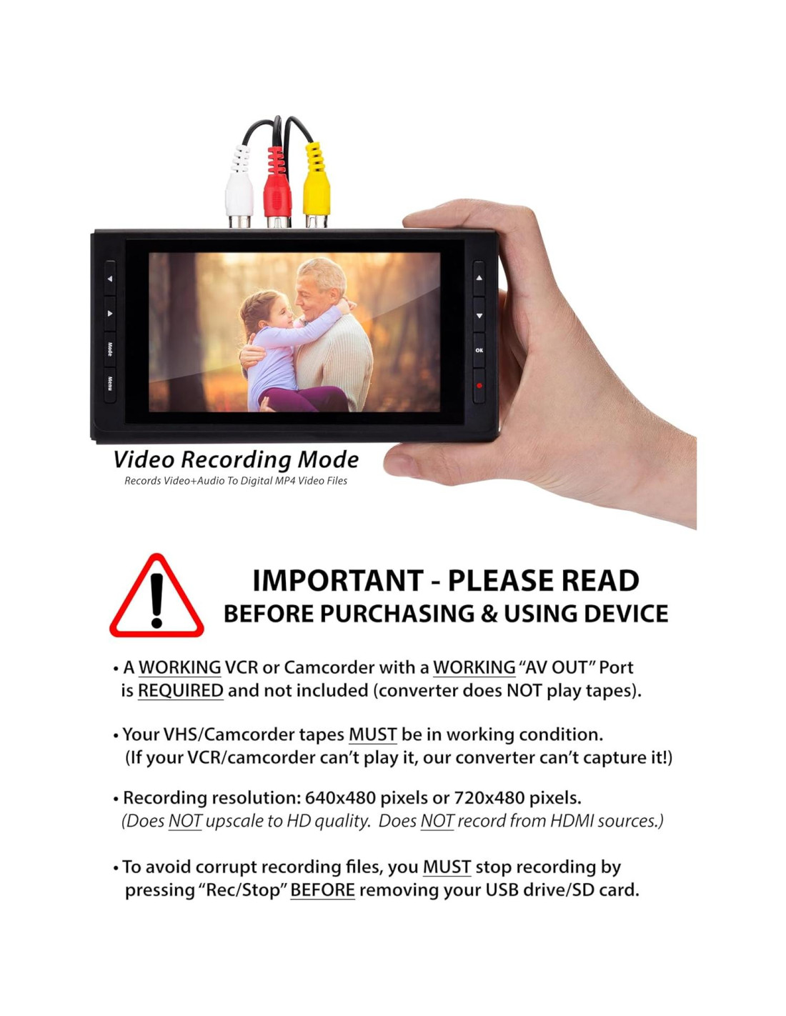 - Graba y digitaliza video y/o audio de VHS, VCR's, reproductores de DVD, DVR's, videocámaras, Hi8, sistemas de juegos retro, cintas de casete, discos de LP, tocadiscos y más (IMPORTANTE: SE REQUIERE UN VCR/VIDEOCÁMARA EN FUNCIONAMIENTO Y CINTAS DE VIDEO EN FUNCIONAMIENTO; EL CONVERTIDOR NO REPRODUCE CINTAS DE VIDEO POR SÍ MISMO)