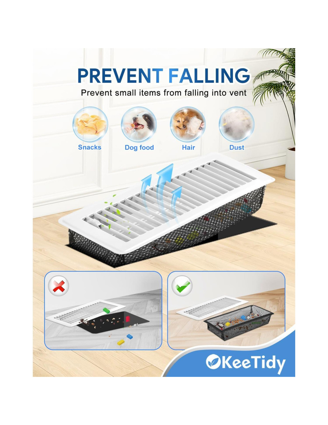 - PREVENCIÓN DE ENTRADA DE PEQUEÑAS COSAS: La red de pantalla de ventilación de suelo cuenta con un diseño de malla razonable para evitar que pequeñas criaturas salgan de la ventilación, brindándole tranquilidad. También evita que pequeños objetos como joyas, crayones, bloques de construcción, bocadillos, juguetes, comida para mascotas y monedas caigan en la ventilación