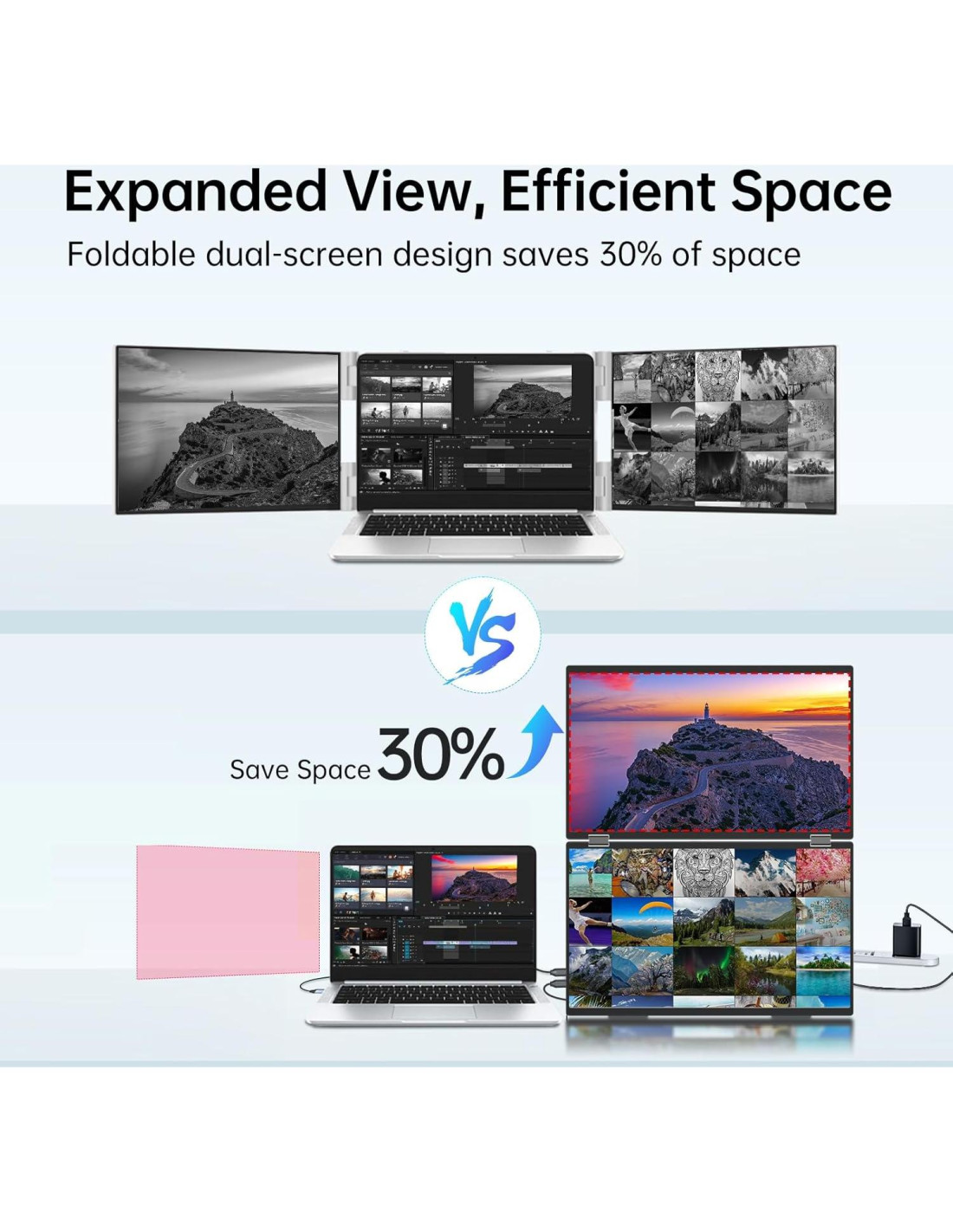 - [Diseño Humanizado para Mayor Comodidad] Los monitores duales vienen con un soporte ajustable de 180 y un sensor de gravedad de 180, y soportan rotación automática de 180 cuando están conectados a Windows o Mac. Este monitor para notebook también soporta rotación de pantalla de 90, pero necesitas configurarlo manualmente en el sistema.