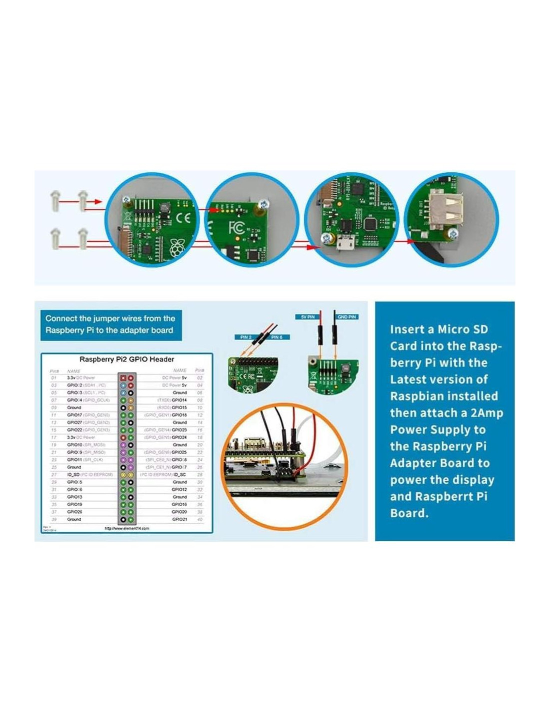 Contenido del kit: adaptador de pantalla táctil de 7" cable de cinta dsi 4 x separadores y tornillos 4 x cables de puente especificaciones técnicas pantalla táctil de 7". Dimensiones de la pantalla: 194mm x 110mm x 20mm (incluyendo separadores) tamaño de pantalla visible: 155mm x 86mm resolución de pantalla 800 x 480 píxeles 10 dedos táctiles capacitivos se conecta a la placa Raspberry Pi utilizando un cable de cinta conectado al puerto dsi. La placa adaptadora se utiliza para alimentar la pantalla y convertir las señales paralelas de la pantalla al puerto serial (dsi) en la Raspberry Pi. Se requiere la última versión del sistema operativo Raspbian para funcionar correctamente. Nota: La pantalla funciona con todos los modelos existentes de Raspberry Pi, sin embargo, los agujeros de montaje solo se alinean con el diseño de placa más nuevo de a+, b+ y Pi 2.