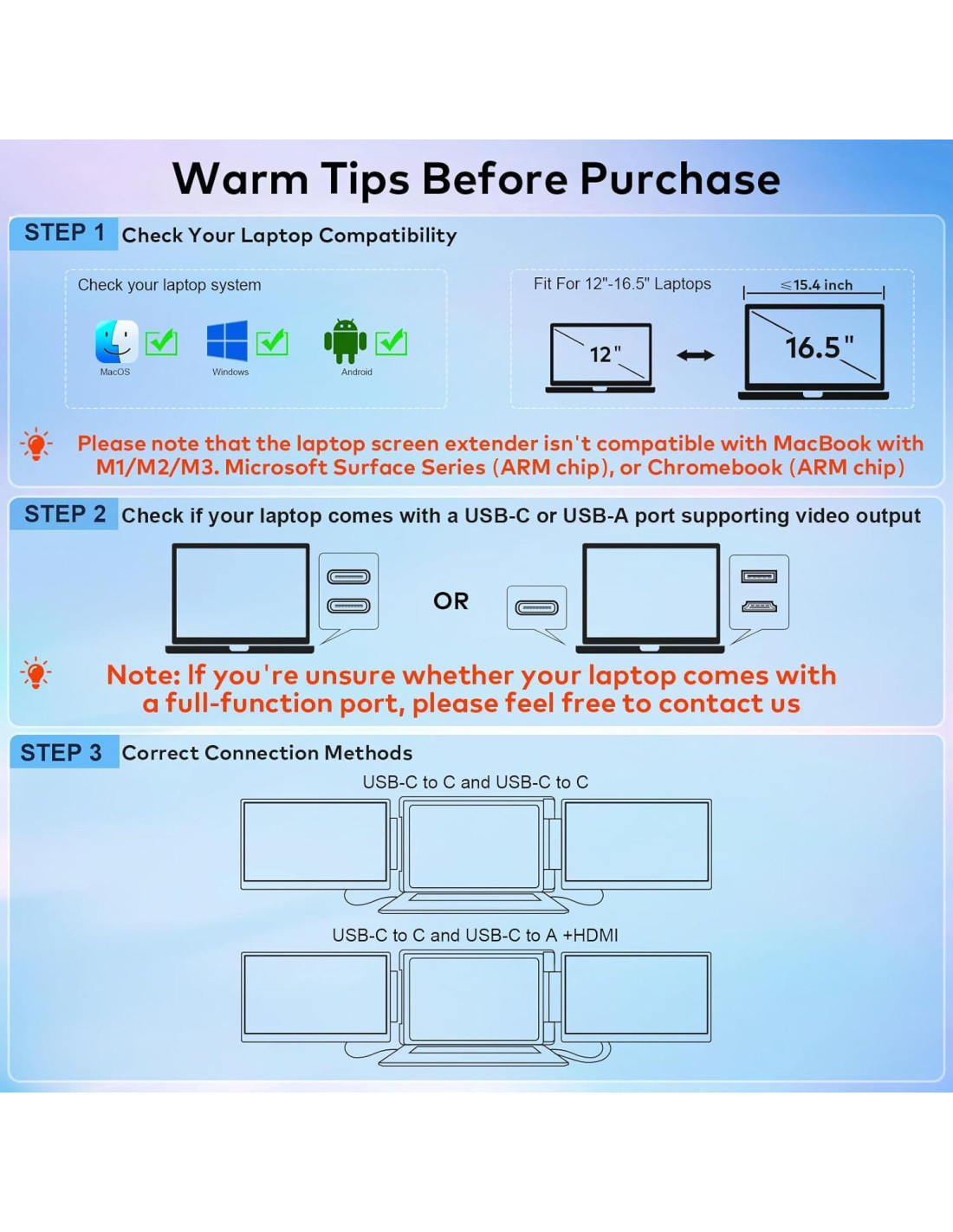 - [Amplia Compatibilidad] El extensor de pantalla para laptop Ladomi está diseñado para colocarse en el escritorio, utilizado ampliamente para laptops de 12"-16.5" y totalmente compatible con MacOS, Windows, Android, Linux, Chrome, Surface, Dex, Switch, Xbox, PS4. NOTAS: Este extensor de pantalla es compatible con MacBooks equipados con chips M1/M2/M3 Pro o Max, pero no funciona para el Macbook Air con chips M1/M2/M3