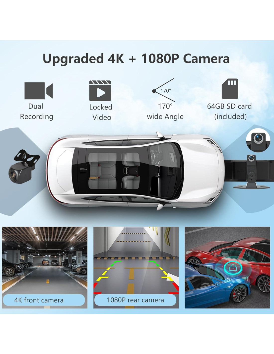 - [Cámara Frontal 4K + Cámara Trasera 1080P] Captura cada momento con las cámaras frontales 4K y traseras 1080P a prueba de agua y visión nocturna. Esta configuración proporciona grabación de video de alta calidad y una vista trasera clara para estacionar y retroceder de manera segura. Ambas vistas, frontal y trasera, graban simultáneamente para un registro completo de tus viajes. Puedes ver repeticiones de video en tu teléfono y nunca perderte momentos importantes (ángulo de visión completo de 178). Consejos: Incluye una tarjeta TF de 64GB, por lo que no es necesario comprar una por separado.