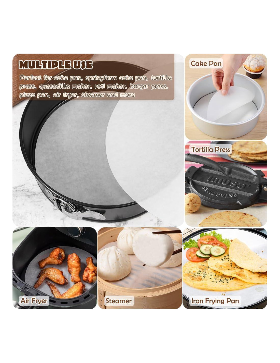 - USO VERSÁTIL: Más allá de hornear, nuestras rondas de papel pergamino de 7 pulgadas tienen múltiples usos, desde hornear pasteles hasta separar hamburguesas. Perfecto para prensa de hamburguesas aplastadas, prensa de carne, prensa de plancha, molde de pastel y más.