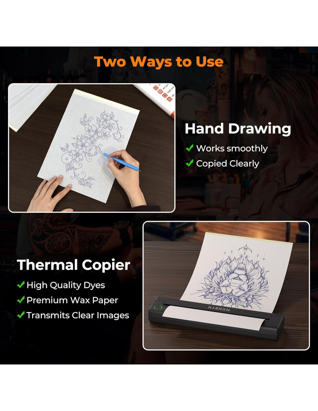 - Transferencias de Impresora y Diseños Dibujados a Mano: Usa una impresora de tatuajes para transferir cualquier diseño basado en líneas al papel de esténcil MUNBYN, o dibuja directamente con un bolígrafo. (Compatible con todas las impresoras de esténcil para tatuajes.)