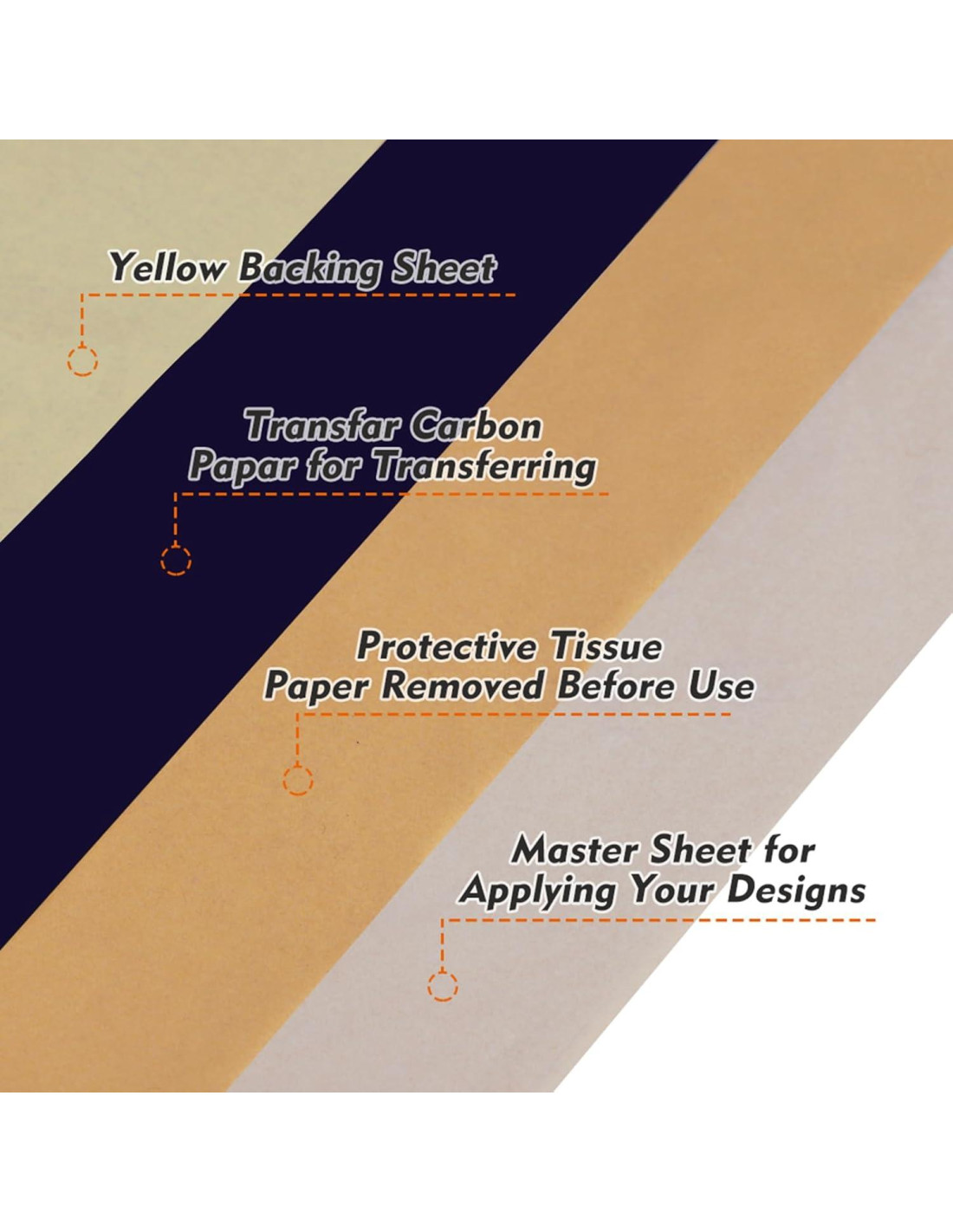 - [Sistema de Precisión de 4 Capas] - Hoja maestra blanca + tejido protector + carbono azul profundo + respaldo amarillo. Asegura líneas limpias y nítidas para esténciles de tatuaje impecables. Diseño fácil de despegar y transferir para una aplicación sin complicaciones.
