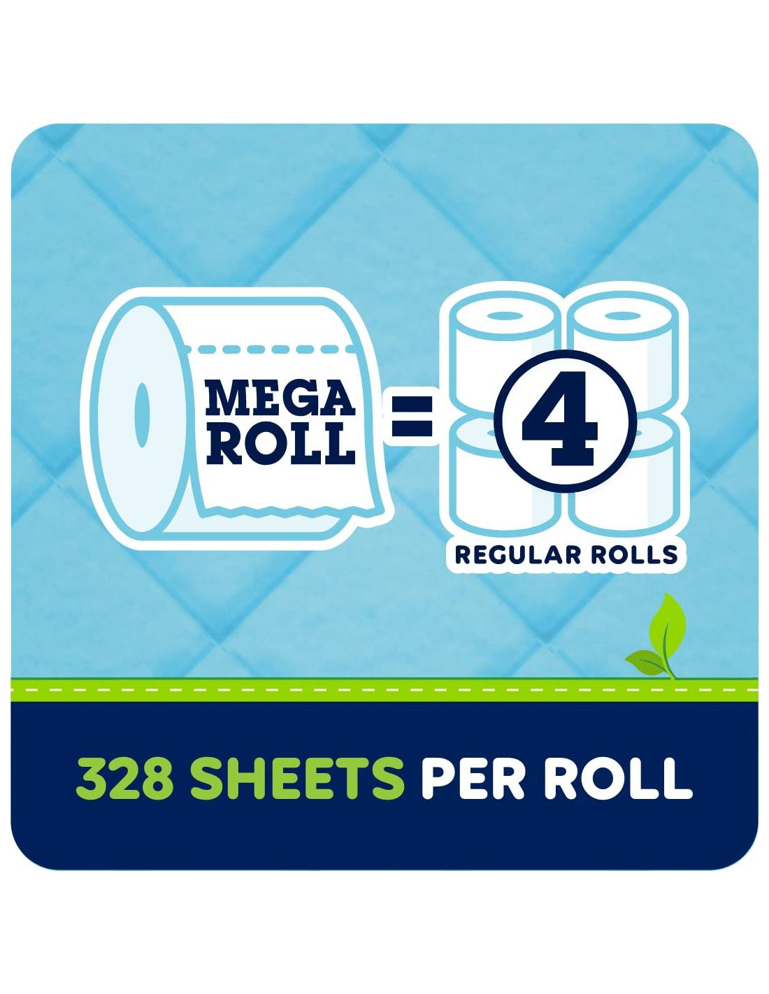 - Cada Rollo Mega tiene 328 hojas de 2 capas que son 4 veces más fuertes y duraderas que la marca de papel higiénico de valor líder cuando está mojado.