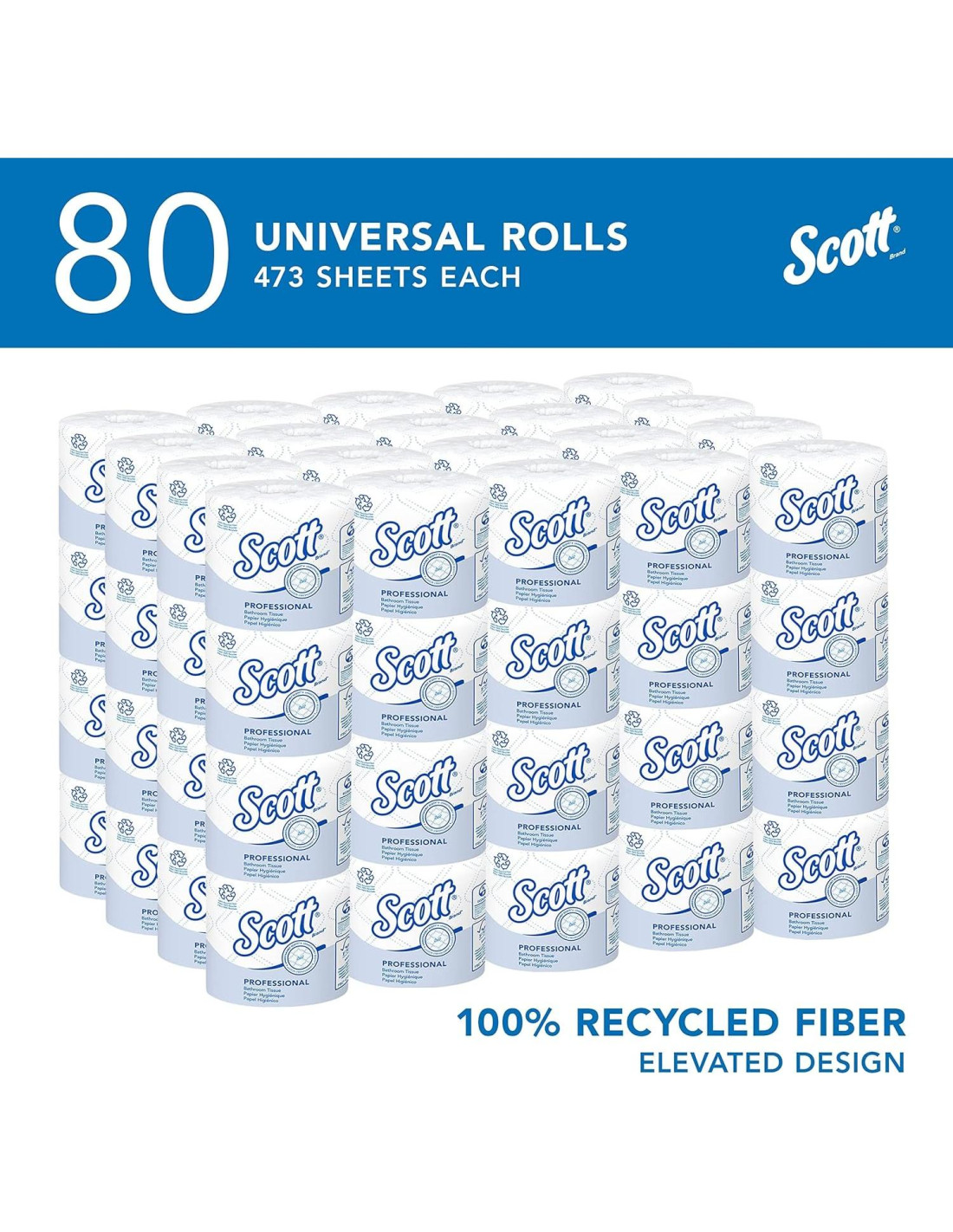 - 473 Hojas/Rollo, 80 Rollos de Papel Higiénico de Fibra 100% Reciclada Scott Profesional/Caja; 37,840 Hojas/Caja; con Diseño Elevado; 2-Capas; Blanco; rollos envueltos individualmente