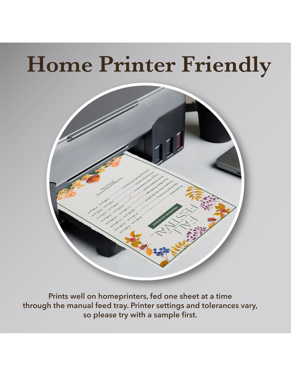 - [Compatible con impresoras domésticas]: Nuestro papel de 150gsm con borde desgastado es compatible con impresoras domésticas, ofreciendo infinitas posibilidades para dejar una impresión duradera con creaciones como menús, invitaciones de boda, tarjetas o incluso libros. Para obtener los mejores resultados, alimenta una hoja a la vez a través de la bandeja de alimentación manual. Dado que la configuración y tolerancias de la impresora pueden variar, recomendamos probar con una muestra primero para asegurar una calidad de impresión óptima. 50 hojas de 10.5 x 15 cm / 10.2 x 15.2 cm, tamaño A6.