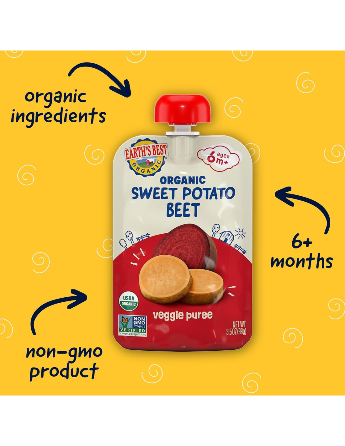 - BOLSA DE PURÉ DE BATATA Y REMOLACHA ORGÁNICA: Incluye doce pouches de 99.22 g de Puré de Verduras Orgánico de Earth's Best