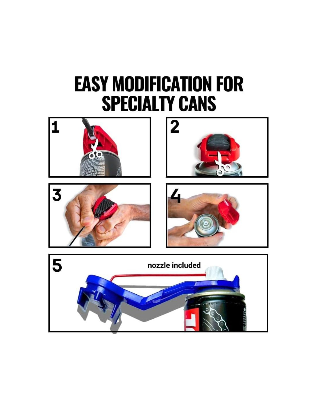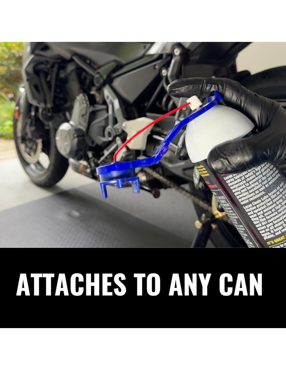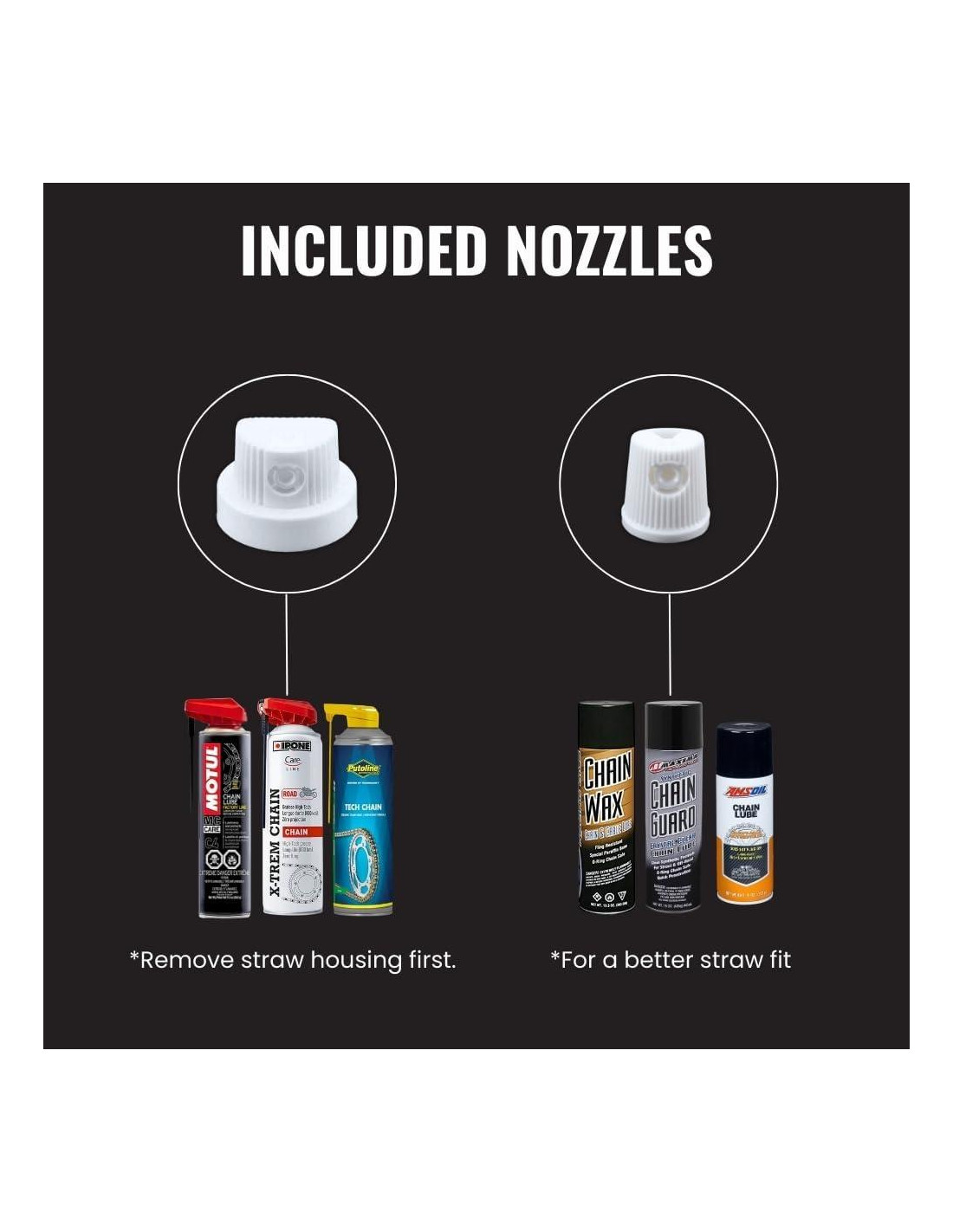 - Compatible con Todas las Latas: Compatible con cualquier lata de aerosol estándar. Usuarios de Motul y Silkolene-retira la pajilla incorporada tirando hacia arriba y conecta nuestra boquilla incluida.
