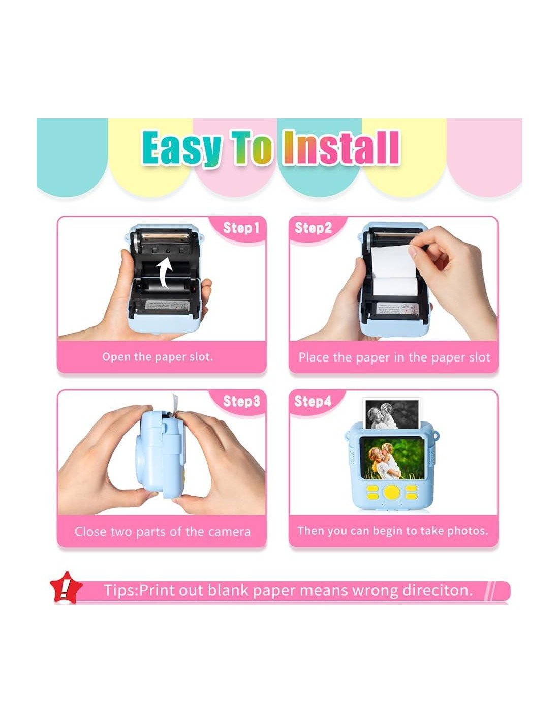 Cada rollo puede imprimir alrededor de 75-90 fotos. Cantidades suficientes de papel de impresión de repuesto están disponibles para sus necesidades de impresión fotográfica a largo plazo. Nuestro papel térmico para cámara dura hasta 3 años sin desvanecerse y se puede conservar durante mucho tiempo. Su hijo puede usar lápices de colores para colorear estas fotos en blanco y negro, nutriendo así la creatividad y la autoexpresión. Les traerá más diversión, ayuda a desarrollar su habilidad artística y les permite expresar sus perspectivas y emociones únicas. Nuestro papel de impresión es pequeño y portátil. ¡Puedes llevarlo contigo para registrar cada hermoso momento de tu vida y en movimiento! Paso 1. Empuje hacia arriba la parte con la lente para abrir la ranura de papel; Paso 2. Coloque el rollo de papel en la ranura de papel. La dirección de instalación del papel es hacia arriba, mirando hacia afuera (imprimiendo fotos en el lado más suave); Paso 3. Cierre las dos partes de la cámara (asegúrese de que el papel sobresalga 3-4 cm de la tapa); Paso 4. Presione el botón de disparo y luego puede comenzar a tomar fotos. Estamos completamente dedicados a inspirar y nutrir la creatividad e imaginación de los niños. Nuestros productos incluyen cámaras de impresión para niños y papel de impresión para cámaras. ¡Queremos ayudar a los niños a descubrir y explorar la belleza del mundo que los rodea y registrar el colorido mundo a través de sus cámaras! ¡Deja que los pequeños fotógrafos disfruten de una infancia maravillosa y preciosa!