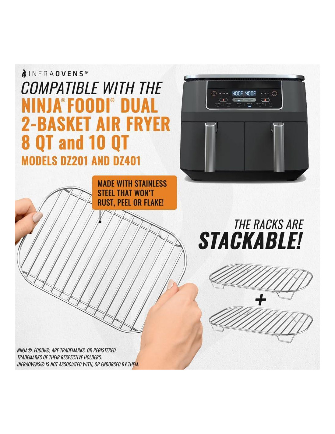 Los estantes de acero inoxidable para freidora de aire, los forros reutilizables, las alfombrillas de malla deshidratadora y el libro de recetas para freidora de aire son los accesorios ideales para freidoras de aire de doble cesta, como la Ninja DZ201 y DZ401 que tienen un sistema de 2 cestas. Infraovens no está asociado ni respaldado por Ninja. Los amplios espacios en los estantes de la freidora de aire los hacen fáciles de limpiar, a diferencia de otros estantes de tipo malla que acumulan residuos. Nuestros estantes están hechos de acero inoxidable que no se oxida, pela ni descama, lo que te permite cocinar a tu antojo sabiendo que siempre son seguros de usar y fáciles de reutilizar. Reemplaza tus estantes de estilo malla con nuestros estantes de freidora de aire de amplia rejilla, luego, combínalos con las alfombrillas de malla para freidora de aire y date la facilidad de uso que necesitas. Este combo de accesorios para freidora de aire mejorará significativamente tu experiencia con la freidora de aire, permitiéndote ahorrar tiempo y hacer tu vida más fácil. Usa los forros reutilizables rectangulares para freidora de aire para proteger tus estantes o cestas de freidora de aire. También es ideal para cocinar alimentos más líquidos o más pegajosos y es apto para lavavajillas. Usa las alfombrillas de malla para freidora de aire para crear un estante deshidratador que no acumule residuos de alimentos pegajosos y desordenados. Cuando termines, simplemente puedes ponerlos en el lavavajillas. Las alfombrillas perforadas para freidora de aire de doble cesta ayudan a mantener limpias tus cestas, bandejas y estantes de freidora de aire mientras permiten que el aire circule, permitiendo que los alimentos se cocinen de manera más uniforme y fácil. Los estantes de acero inoxidable para freidora de aire de doble cesta ayudan a elevar los alimentos, mientras te brindan la versatilidad de cocinar diferentes tipos de recetas que de otro modo no serían posibles. Este paquete de accesorios para freidora de aire incluye: 2 x estantes de acero inoxidable para freidora de aire, 2 x forros reutilizables para freidora de aire, 2 x forros de malla para freidora de aire, 2 x forros perforados para freidora de aire, 1 x folleto de recetas para freidora de aire. Es compatible con la Freidora de Aire de Doble Cesta Ninja, 2-Cesta o Doble Cesta de Doble Zona.