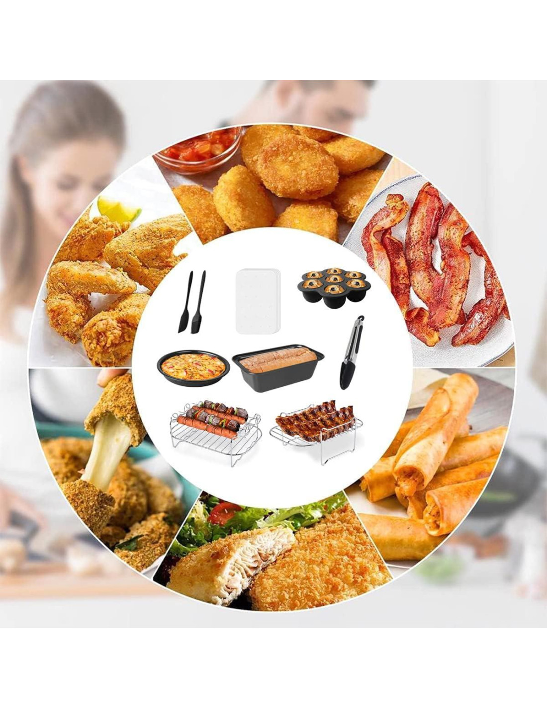 - Juego de Accesorios de 10 Piezas - Cada paquete viene con un molde para pastel resistente al calor, sartén para pizza x 2, rejilla metálica multipropósito, rejilla para pinchos, molde para bocados de huevo, forros de papel para freidora de aire, cepillo para untar, espátula de silicona y pinzas de cocina para ayudarte a hacer pan, pizzas, pasteles, kebabs y más comida deliciosa y saludable mientras ahorras tiempo y esfuerzo