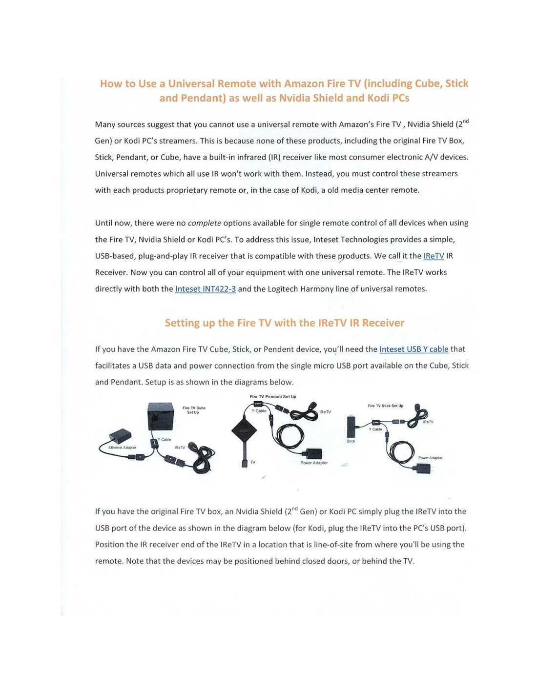 El receptor IR USB IReTV está diseñado y construido para funcionar con Fire TV (no funciona con el Stick Gen 1 más antiguo) (Stick, Cube y Pendant requieren nuestro cable USB Y), Nvidia Shield-2 Generación Estándar y 2019 Pro (las versiones de 1 Gen y Pro más antiguas no requieren un receptor IR adicional), aplicaciones relacionadas con Media Center y MCE, así como Kodi en una PC y Kodi en Raspberry Pi. Este receptor IR solo funciona con los controles remotos Inteset INT422 y Harmony (Control remoto NO incluido). Para instalar el receptor IR IReTV usando el control remoto INT422, simplemente conecta el conector USB en el puerto del dispositivo que deseas controlar e ingresa el código del dispositivo para ese dispositivo en uno de los botones de código de dispositivo disponibles (A, B, C, D) en la parte superior del control remoto. Luego puedes usar los otros botones del dispositivo para tu TV, caja de cable, etc. Hemos proporcionado un mapa de teclas para estos dispositivos arriba o puedes ver el mapa en nuestro sitio web. Los códigos de dispositivo INT422 son: 02049 (Fire TV), 01272 (Media Center), 02000 y 01272 (Kodi en una PC y Kodi en Raspberry Pi) y 04918 (Nvidia Shield). El proceso de configuración y el mapeo de teclas para el control remoto Logitech Harmony están disponibles en nuestro sitio web. Actualmente, solo Fire TV y Nvidia Shield (2 Gen) son controlables usando el control remoto Harmony con el receptor IReTV. Contáctanos para obtener diagramas de configuración o ve a nuestro foro para más información. Puedes obtener los códigos de dispositivo para todos los demás dispositivos que pueden ser controlados por el INT422 en nuestro sitio web. Si tienes alguna pregunta, contáctanos en: universalremotes.net.