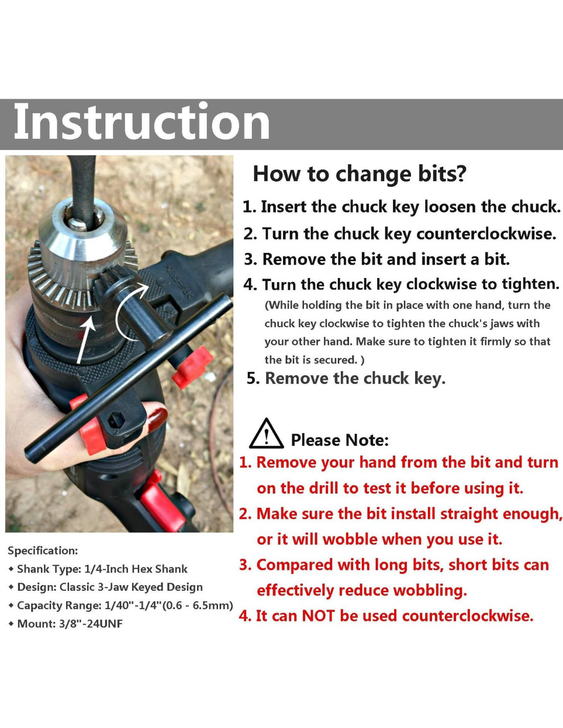 - Diseño clásico de 3 mordazas con llave sostiene de manera segura una amplia gama de brocas de torsión de 1/40"-1/4" de manera conveniente.