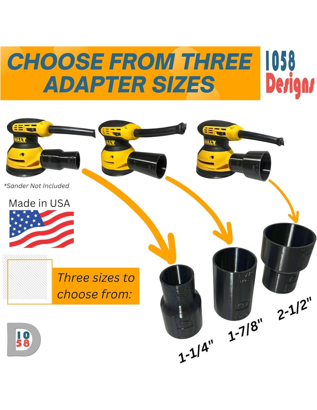 El adaptador de manguera de vacío 1-1/4" DEW-114-B-RND de 1058DESIGNS está diseñado específicamente para adaptarse a las siguientes lijadoras: Compatible con la lijadora de hoja de 1/4 de pulgada DeWalt DWE6411, DWE6411K, Compatible con la lijadora orbital de 5 pulgadas DeWalt DWE6420, DWE6421, DWE6421K, Compatible con la lijadora orbital aleatoria DeWalt DWE6423, DWE6423K, DWE6423R, Compatible con la lijadora de palma de hoja de 1/4 DeWalt DCW200, DCW200B, DCW200D1, DCW210D1, DCW200P1 (se adapta al puerto de polvo negro existente), Compatible con la lijadora orbital de 5 pulgadas DeWalt DCW210, DCW210B, DCW210BR, DCW210P1, Compatible con la lijadora orbital de 5 pulgadas CRAFTSMAN CMEW231, CMEW230, Compatible con la lijadora de palma de hoja de 1/4 CRAFTSMAN CMCW222, CMCW222B (se adapta al puerto de polvo negro existente). Orgullosamente HECHO EN EE. UU.