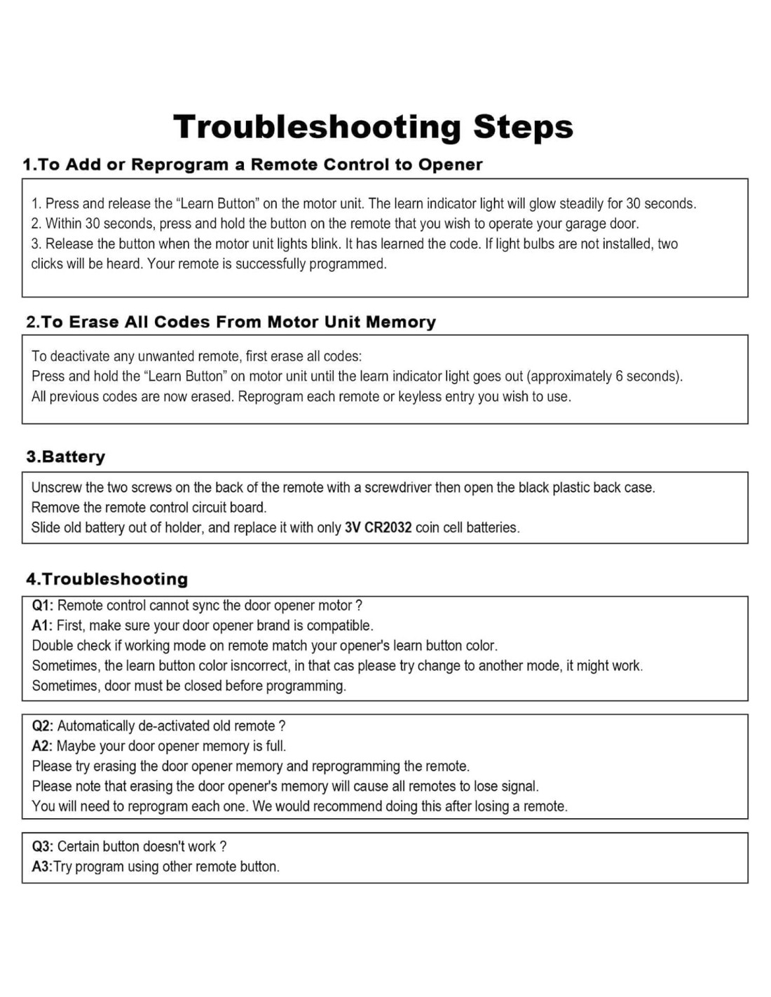 1. Verifica el color del botón de aprendizaje de tu abridor de puerta de garaje 2. Cambia la luz LED de este control remoto de acuerdo al color del botón de aprendizaje de tu abridor (siguiendo nuestro manual) 1) La luz LED verde es para el botón de aprendizaje Morado/Rojo/Naranja 2) La luz LED roja es para el botón de aprendizaje Amarillo/Verde 3. Presiona el botón de aprendizaje en tu abridor de garaje, y luego presiona el botón de nuestro control remoto 1) Presiona estos 2 botones al mismo tiempo, la LED parpadeará 2) Luego presiona el botón que deseas cambiar Usa un destornillador pequeño para desatornillar los dos tornillos en la parte posterior del control remoto, luego abre la caja negra 1) Asegúrate de que el modelo o marca de tu abridor de puerta esté en nuestra lista de compatibilidad 2) Verifica nuevamente si el modo de trabajo en el remoto coincide con el color del botón de aprendizaje de tu abridor. A veces, el color del botón de aprendizaje no es correcto, en ese caso, intenta cambiar a otro modo, podría funcionar 3) A veces, la puerta debe estar cerrada antes de programar