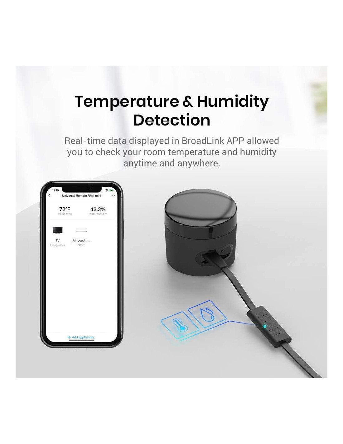 - [CARACTERÍSTICAS] : Crea múltiples temporizadores y escenas personalizadas según necesites para controlar tus dispositivos de hogar inteligente. Configuración simple y fácil para crear una casa inteligente para ti. Soporta la detección externa de Temperatura y Humedad de la habitación donde se encuentra el dispositivo, que se mostrará en la aplicación BroadLink. Puedes establecer fácilmente disparadores, como encender tu aire acondicionado automáticamente cuando la temperatura sube.