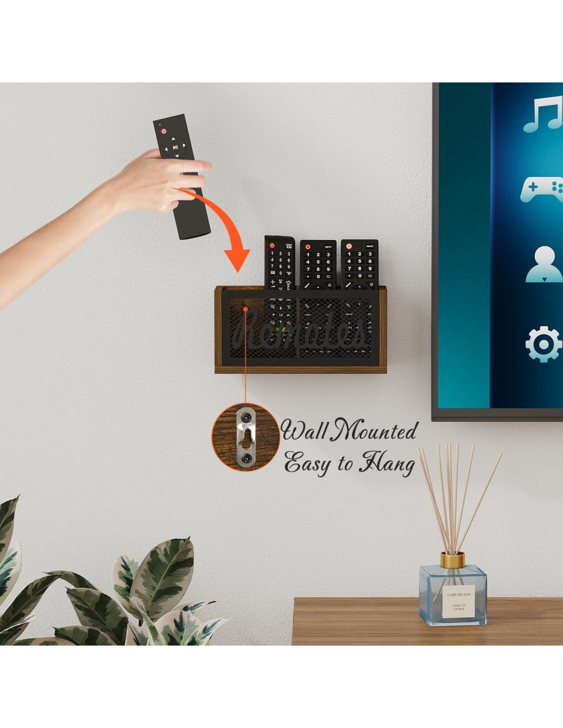 - Diseño Mejorado: Este soporte de control remoto cuenta con un elegante color marrón vintage que combina perfectamente la tecnología moderna con la elegancia clásica. La partición del medio evita que los controles remotos se deslicen y caigan en la caja. La malla de hierro frontal está impresa con la palabra prominente "CONTROLES", lo que lo convierte no solo en una solución práctica para organizar tus controles remotos, sino también en una decoración de pared elegante.
