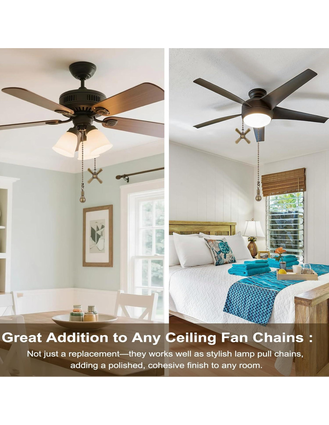- ATRATIVA Y FÁCIL DE INSTALAR: Elegante, longitud versátil - 30.5 centímetros, se adapta a todas las cuentas de 3 mm de diámetro estándar, de alta resistencia para que no se balanceen con el ventilador. Fácil de instalar en segundos y ajustar la longitud según tus necesidades (las tijeras funcionaron bien).