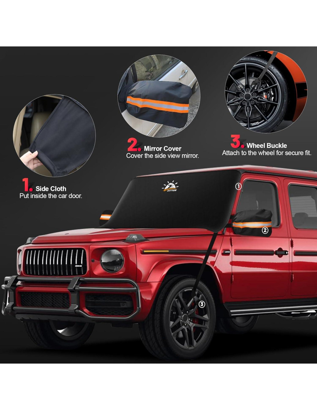 - | Fácil de Colocar con Gran Protección | - Diseñada por nuestro equipo de expertos en parabrisas de automóviles, las cubiertas de nieve para automóviles Zettum son muy fáciles de poner y quitar. Con la cubierta en su automóvil, no más preocupaciones por la nieve, granizo, escarcha, viento, luz solar, lluvia, polvo, resina, hojas, escombros y excrementos de aves, etc. ¡Zettum será el protector resistente de su automóvil exterior no solo en invierno sino también en todas las estaciones!