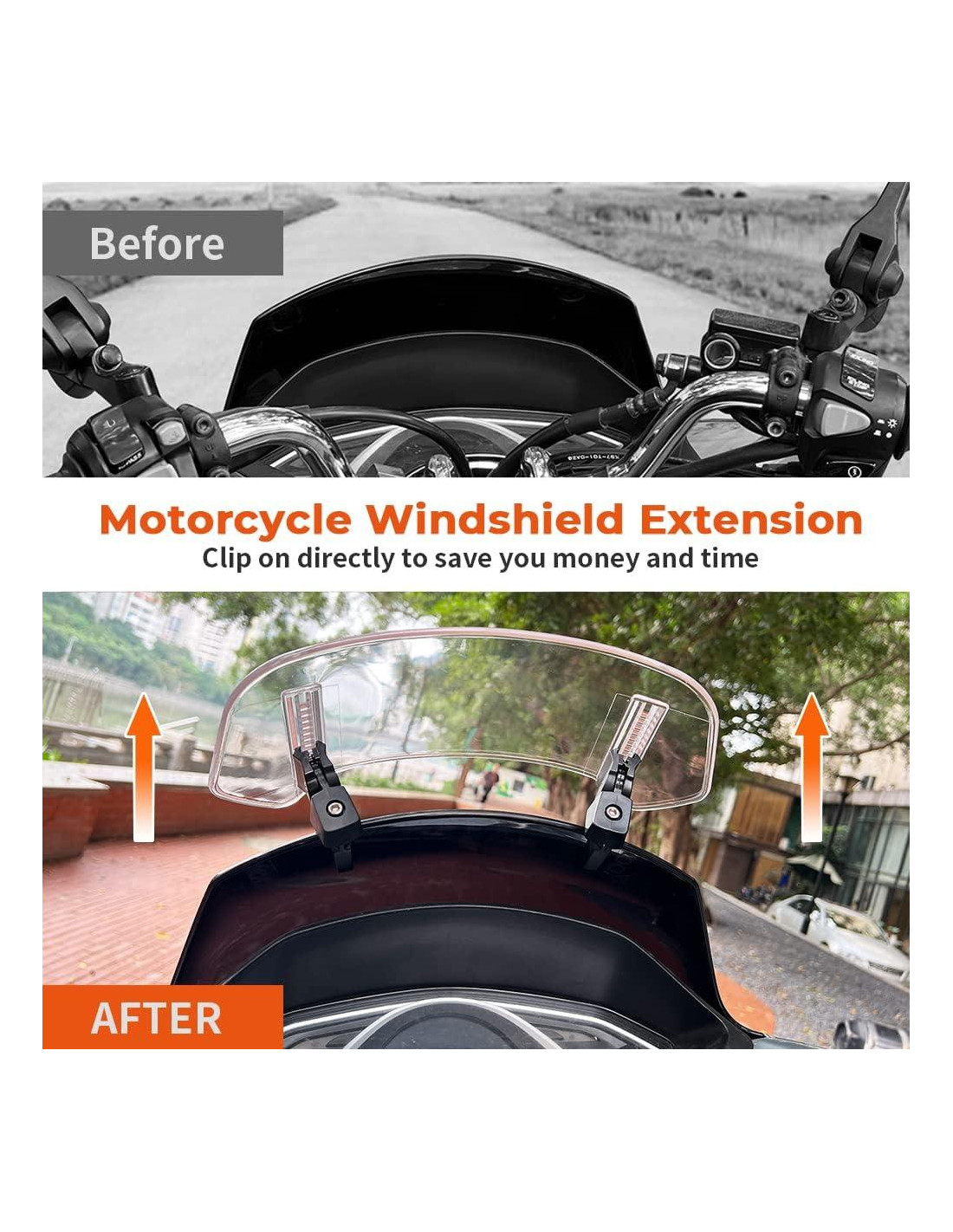- Reduce el Ruido del Viento y el Golpeteo del Casco Nuestra extensión de parabrisas de motocicleta reduce el ruido del viento y la turbulencia y mantiene su casco tranquilo. Así puede concentrarse en la carretera y disfrutar de un viaje más silencioso y suave.