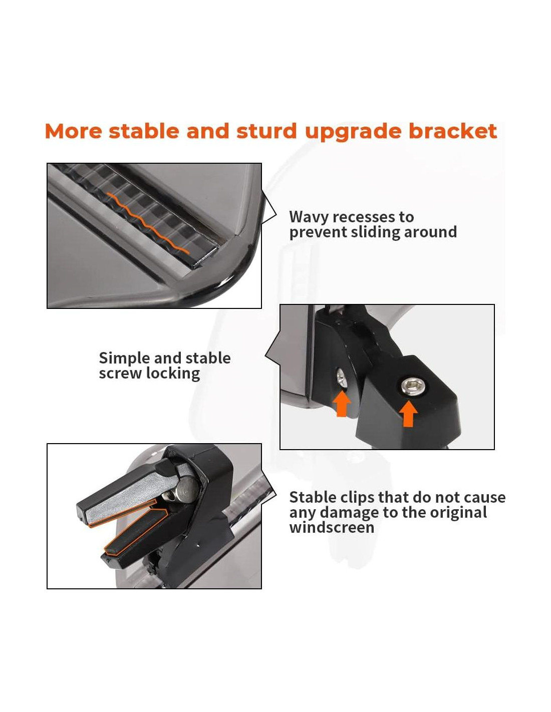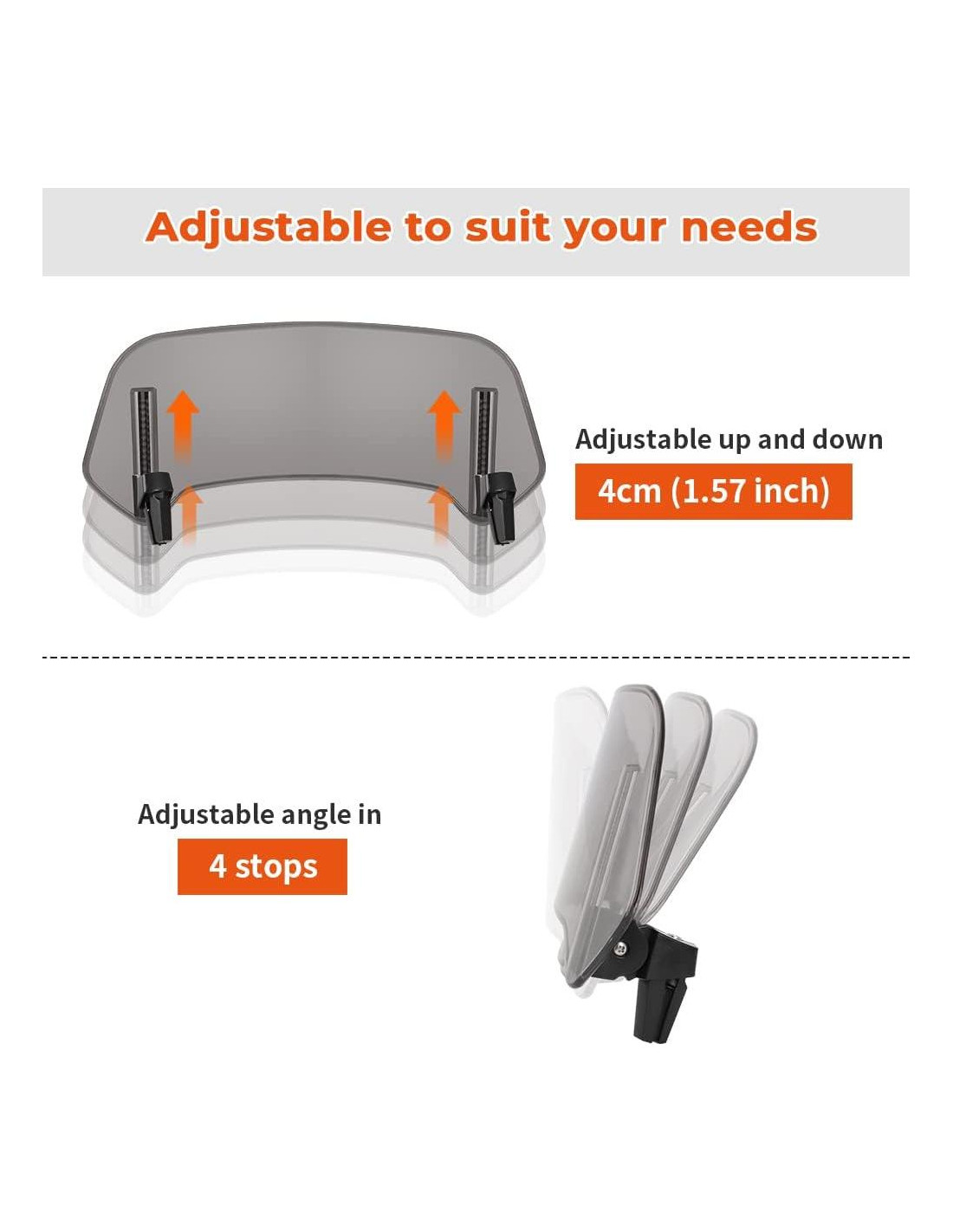 - Diseño de soporte estable El soporte de extensión de parabrisas de motocicleta mejorado está hecho de material de nylon de alta calidad, que es resistente y duradero. La altura y el ángulo se pueden ajustar según sus necesidades, son fáciles de bloquear y no tiene que preocuparse por que se desarme.