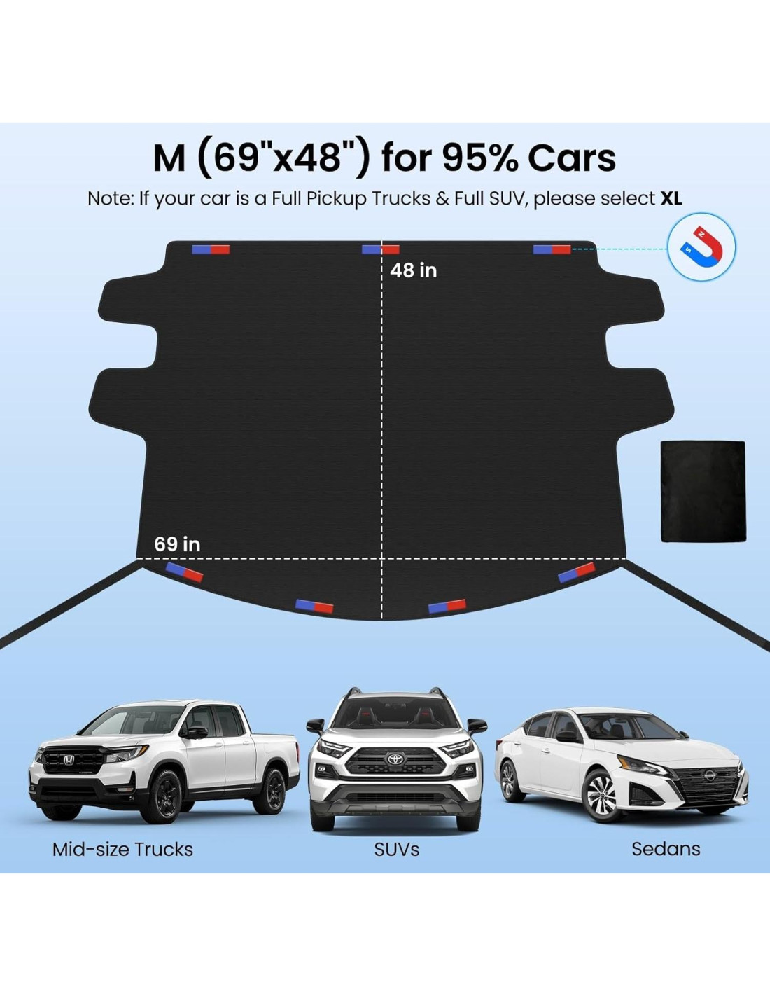 - [Diseño de Bordes Magnéticos, Ajuste Seguro] Esta cubierta anti-nieve magnética para coche está equipada con 7 imanes incrustados a lo largo de los bordes para proporcionar estabilidad adicional contra el viento y la nieve, evitando que se levante. Dos solapas de ventana anti-robo y 2 correas que se ajustan alrededor de los neumáticos mantienen la cubierta anti-nieve en su lugar. Con estas tres capas de seguridad, nunca dejes tu parabrisas expuesto a los elementos.