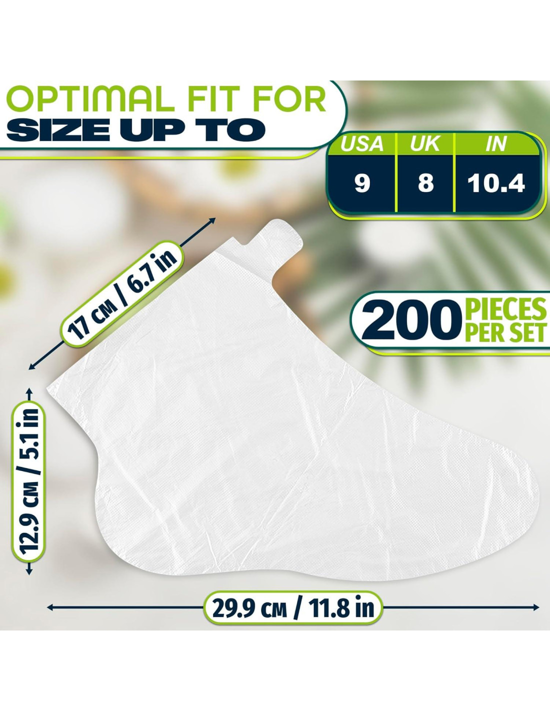 - ¡ATENCIÓN - VERIFIQUE EL TAMAÑO - CONSULTE LA IMAGEN 2! Estas guantes para pies de 11.8"L x 6.7"W (30 cm x 17 cm) para hidratación con un talón de 5.1" (13 cm) vienen en un paquete de 200 piezas con 200 etiquetas para un cierre seguro, diseñadas para mantener la cera de parafina firmemente en su lugar