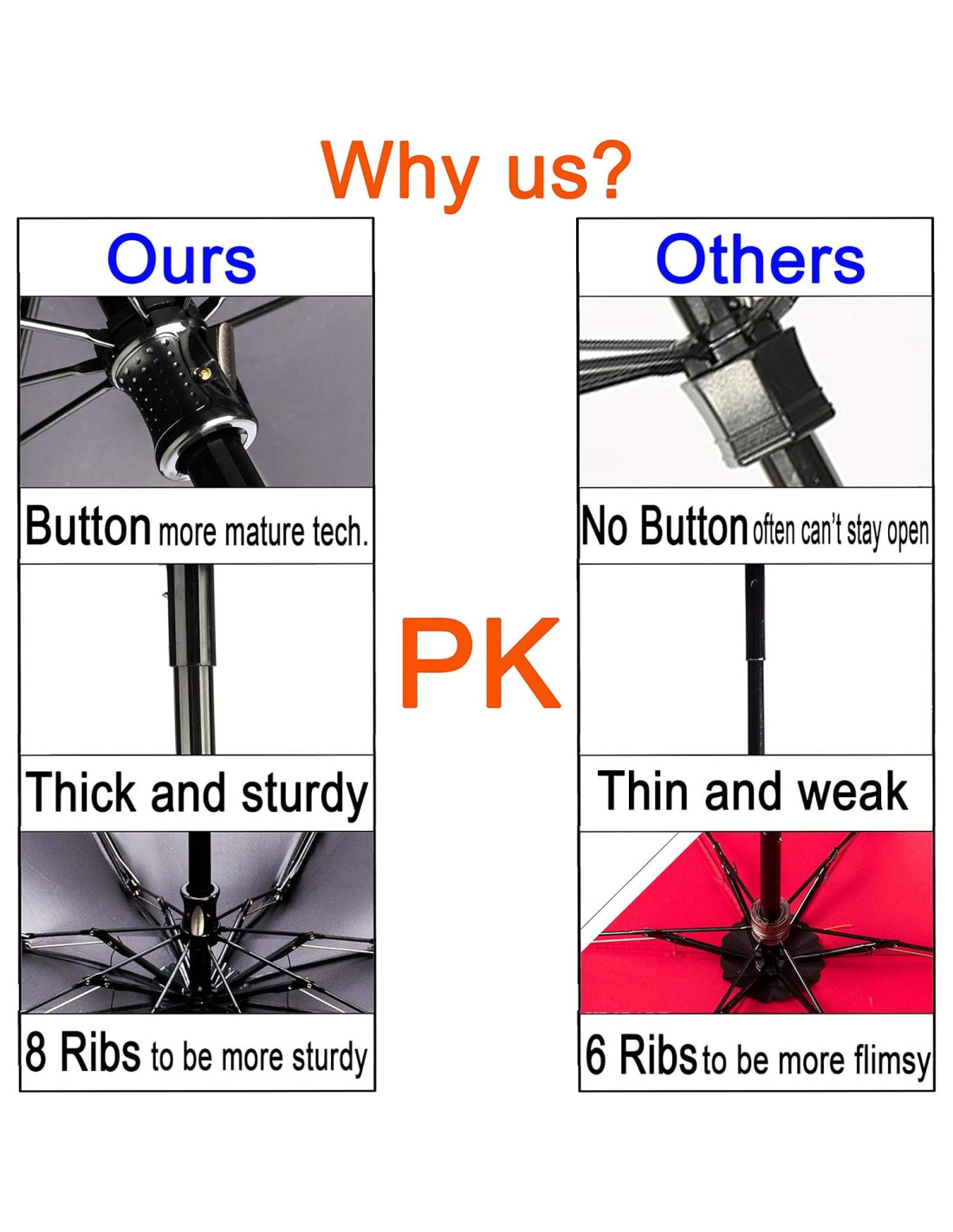 - DISEÑO A PRUEBA DE VIENTO MEJORADO - 8 varillas de fibra de vidrio reforzadas con un marco y eje de metal resistente hacen que el dosel sea altamente resistente al viento para tormentas y el duro exterior, que no es fácil de oxidar y más duradero que otros paraguas de 6 varillas. Puede resistir vientos de hasta 60 MPH (96,56 km/h), brindándote seguridad incluso en mal tiempo.