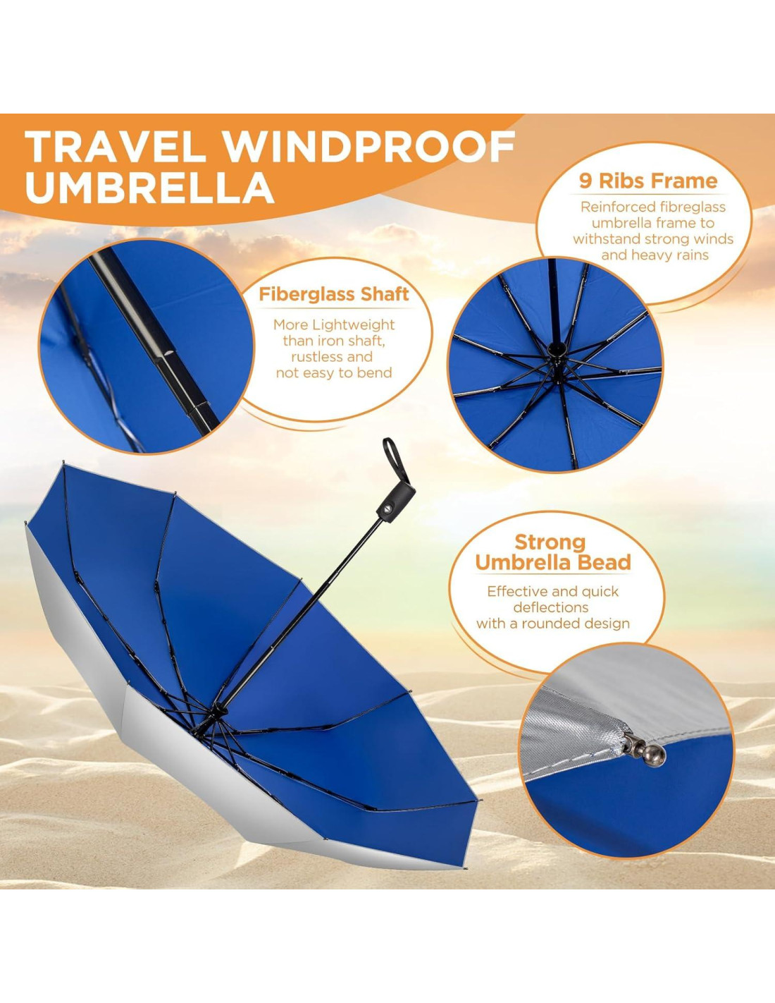 - [Estructura Estable que Ofrece Fuerte Resistencia al Viento] Este paraguas bloqueador UV tiene 9 varillas de fibra de vidrio reforzadas y tela 210T, lo que hace que el paraguas UPF no solo sea liviano y portátil, sino también lo suficientemente resistente como para soportar vientos fuertes. Puedes disfrutar de tus vacaciones o viajes al aire libre sin preocuparte de que el paraguas de protección UV se rompa o de que te quemes con el sol.