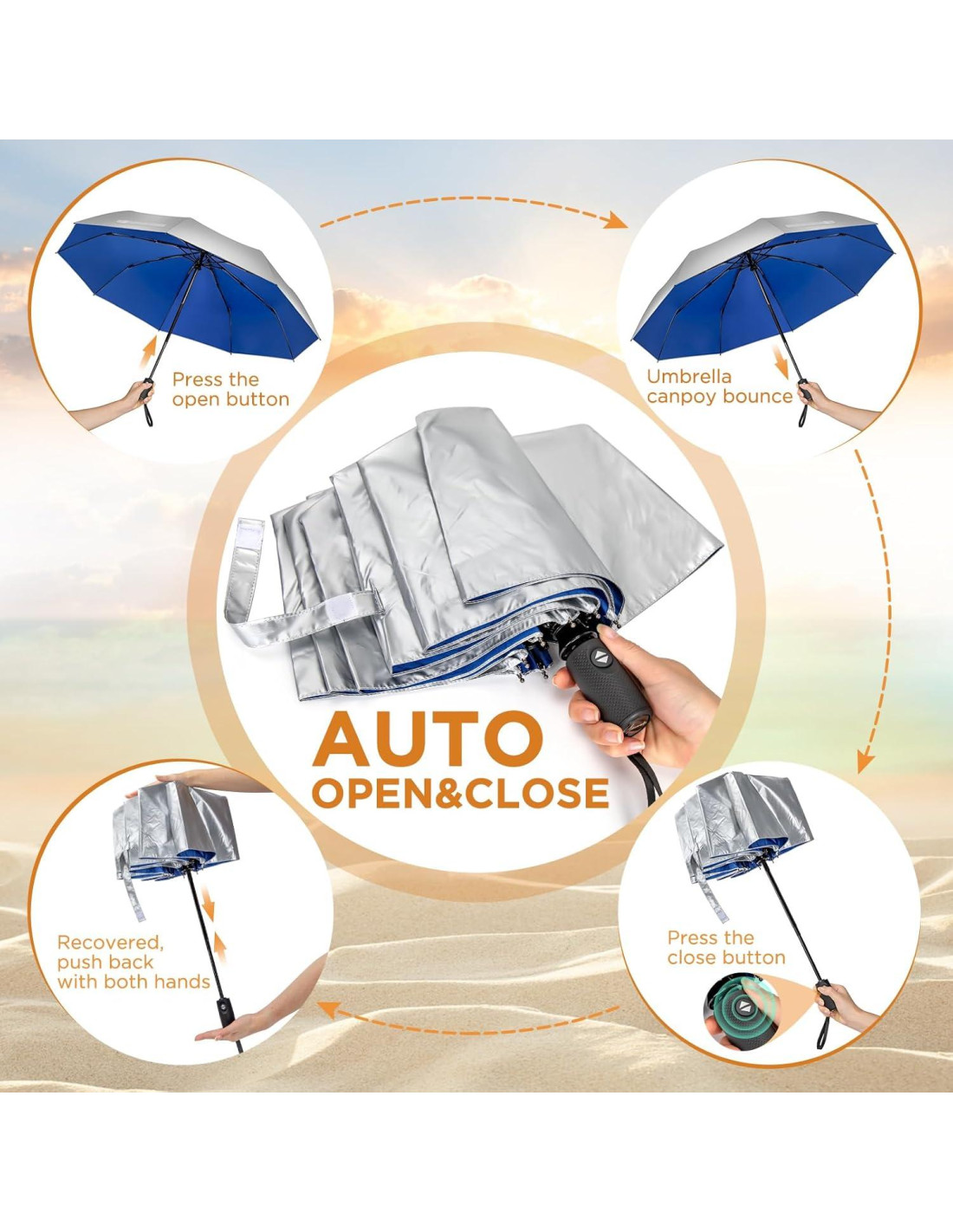 - [Paraguas UV Confiable] Nuestro paraguas reflectante para protección solar está diseñado específicamente para bloquear el sol y prevenir quemaduras solares. Y apenas te preocupas de que este paraguas plateado se rompa o se voltee en los vientos. Nuestro objetivo es ofrecer una fuerte protección mientras viajas o disfrutas de actividades al aire libre.