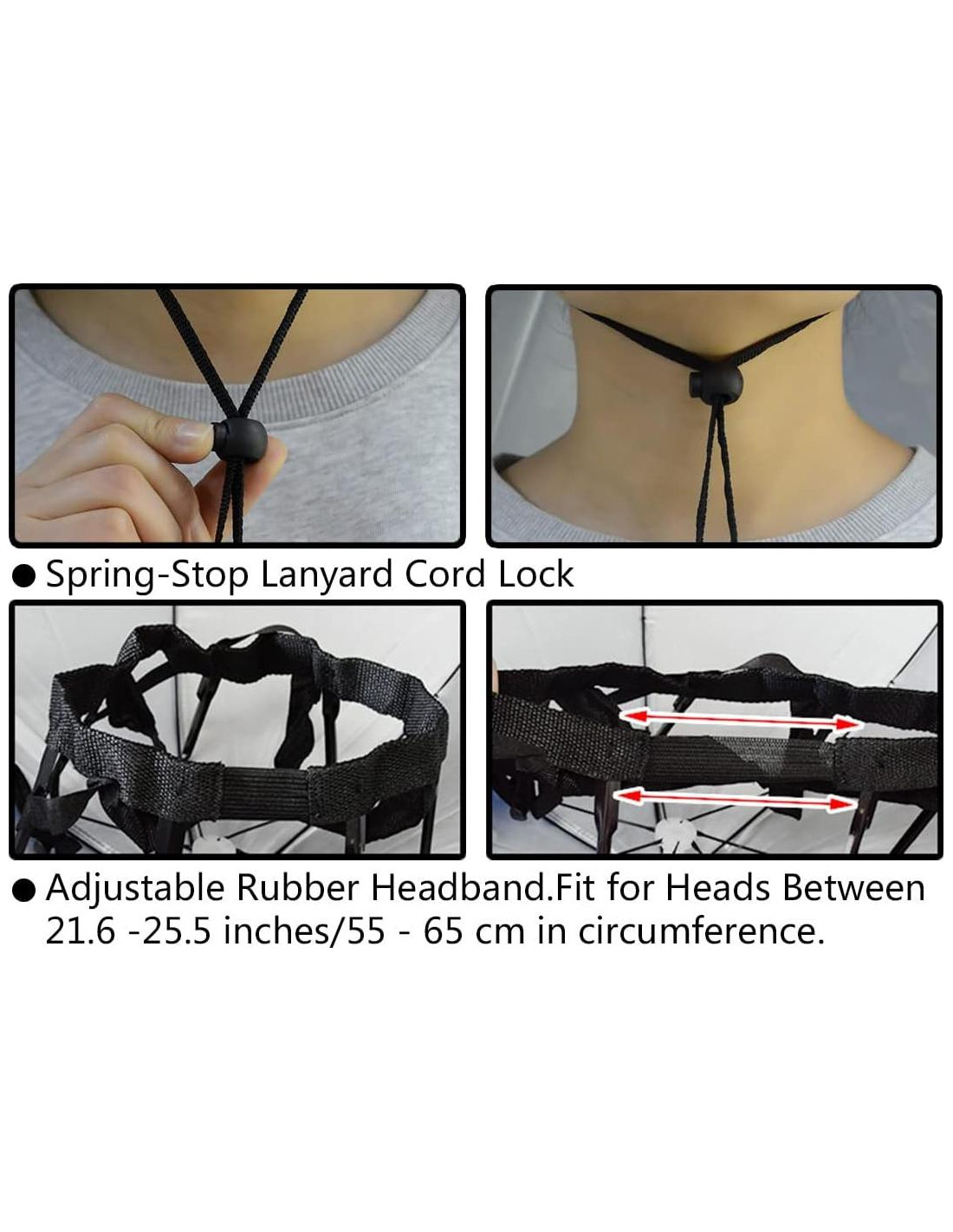 - Correa para la Barbilla Ajustable: Se adapta a la mayoría de las cabezas de adultos (Cabezas entre 55 - 65 cm de circunferencia); banda elástica y correa para la barbilla ajustable para que se ajuste bien a tu cabeza. Te liberará las manos mientras pescas, juegas golf, jardinería o tomas fotografías, etc.