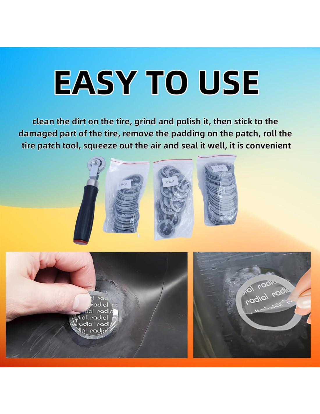 - FÁCIL DE USAR: Solo necesita sacar los parches para neumáticos, limpiar la suciedad en el neumático, muela y pula, luego adhiera a la parte dañada del neumático, retire el acolchado del parche, enrolle la herramienta de parcheo de neumáticos, exprima el aire y selle bien, es conveniente, rápido y eficiente para reparar, ahorrando su tiempo y energía.