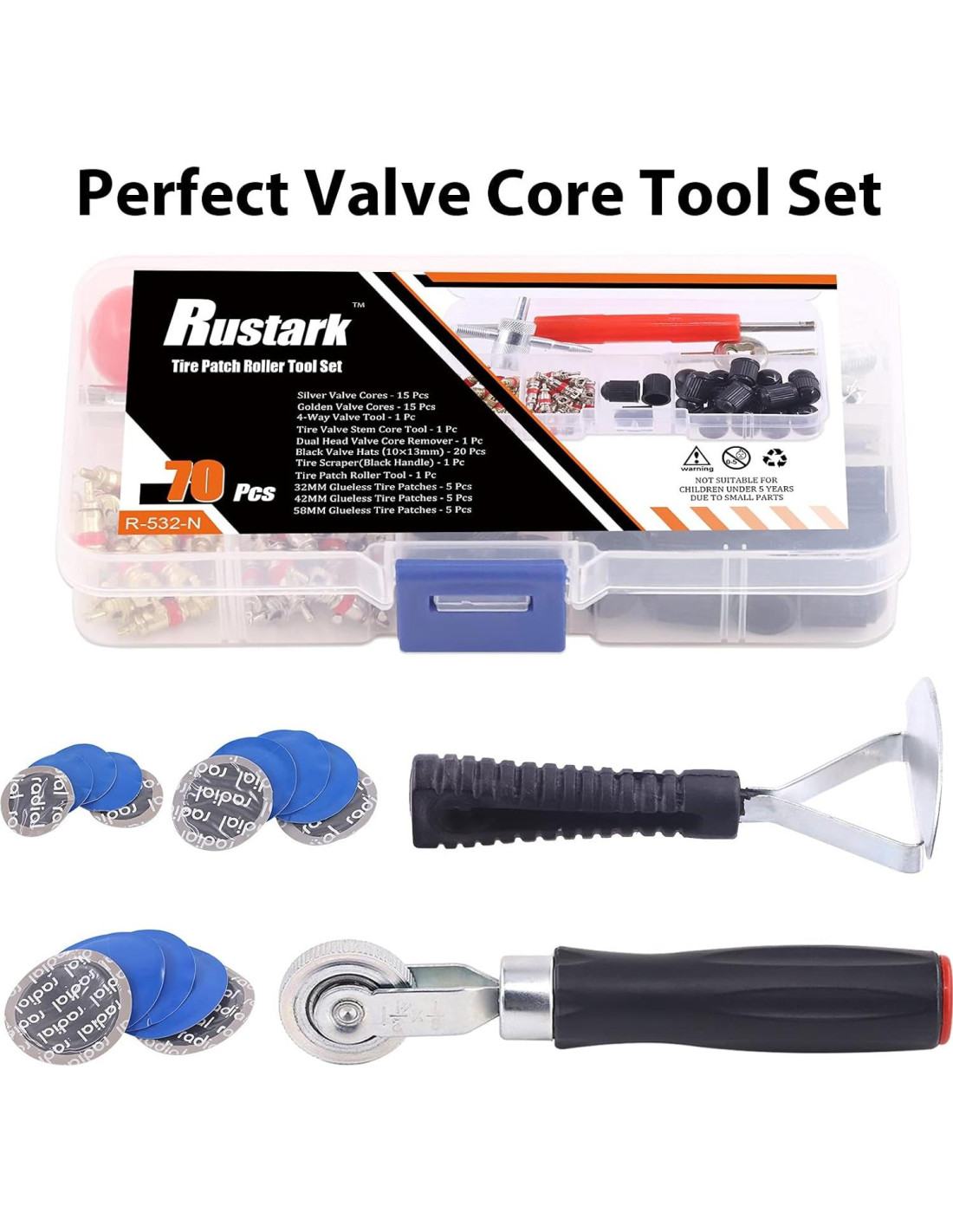 - [Qué Hay en el Paquete] ------- Este conjunto contiene 70 piezas seleccionadas de herramientas de reparación de parches de neumáticos y extracción de válvulas: 1 raspador de neumáticos 1 costurero de reparación de neumáticos 1 llave de válvula 1 herramienta de válvula de 4 vías 1 extractor de núcleo de válvula de doble cabeza 20 tapas de válvula negras 15 núcleos de válvula plateados 15 núcleos de válvula dorados 8 parches de reparación de neumáticos para punciones en 3 tamaños. Todas las piezas pequeñas están organizadas en un resistente estuche de almacenamiento, fácil de sacar, meter y mantener limpio.