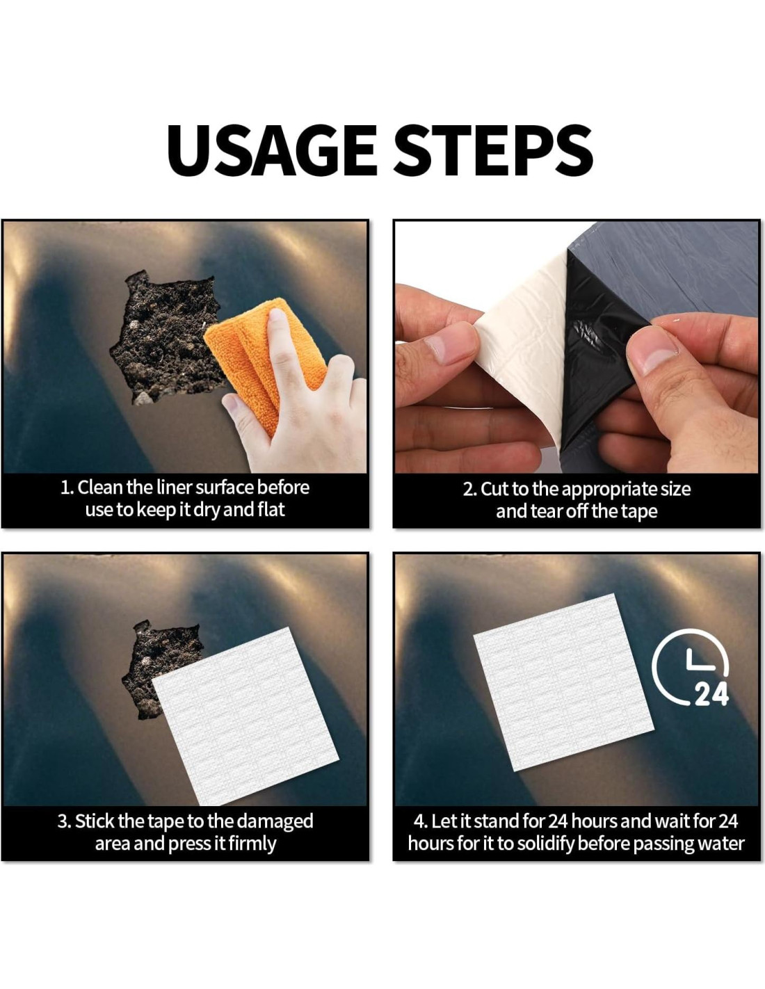 - Uso Versátil: El parche de reparación de liner para estanque cuenta con un fuerte adhesivo que crea un vínculo impermeable entre capas de membrana u otras superficies de liner, lo que lo hace ideal para reparaciones de liner de estanque, protecciones de techo y diversas tareas de sellado, perfecto para proyectos de bricolaje en casa.