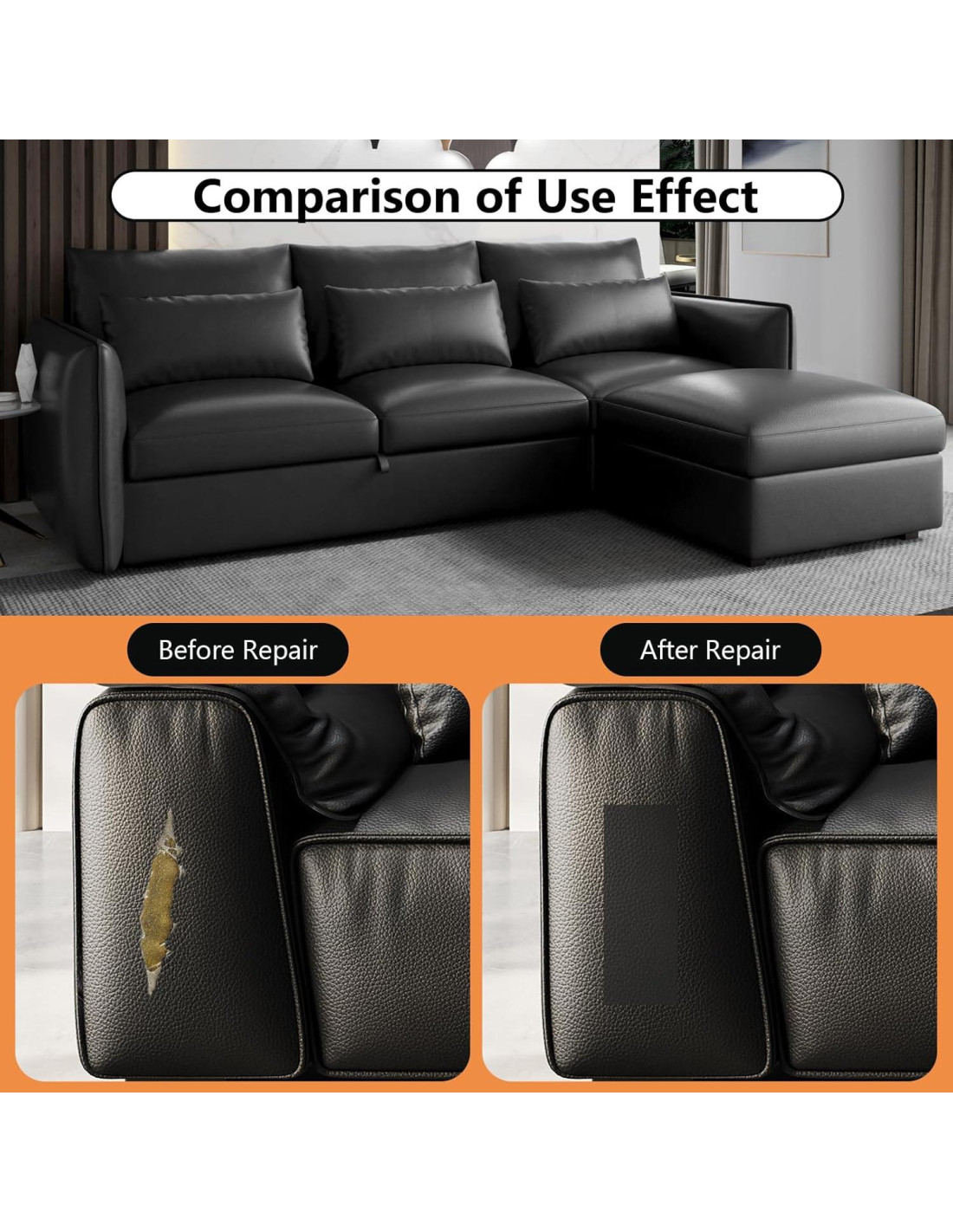 - [Amplia Aplicación] : La Cinta de Reparación de Cuero se puede usar para rasguños, desgarros, agujeros, quemaduras o grietas en objetos hechos de cuero, vinilo y muchos otros tejidos de tapicería para superficies irregulares o curvas. Como sofás, sillas, asientos de coche, bolsas, carteras, botas, chaquetas, equipaje, asientos de coche, cinturones, guantes, asientos de motocicleta, sillones, bolsos, asientos de camiones.