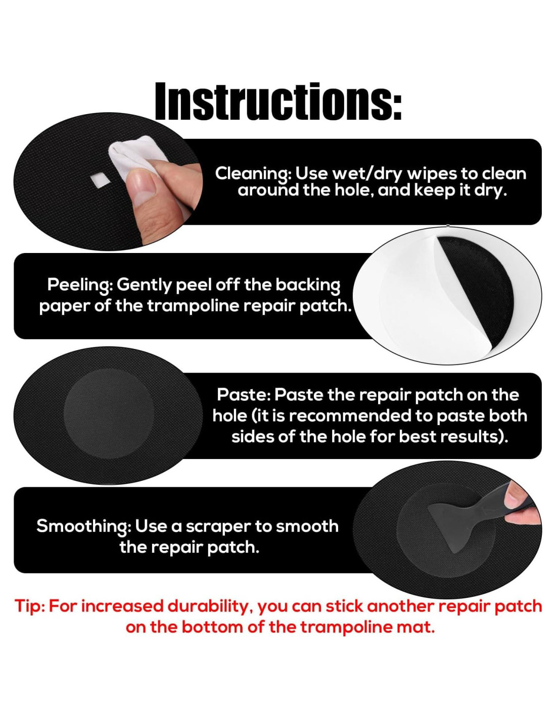 - Fácil de usar: Estos parches para trampolín son fáciles de usar; simplemente quita la parte posterior y presiona el parche sobre el área dañada. El raspador incluido es para alisar burbujas de aire y las toallitas húmedas/secos para preparar la superficie.