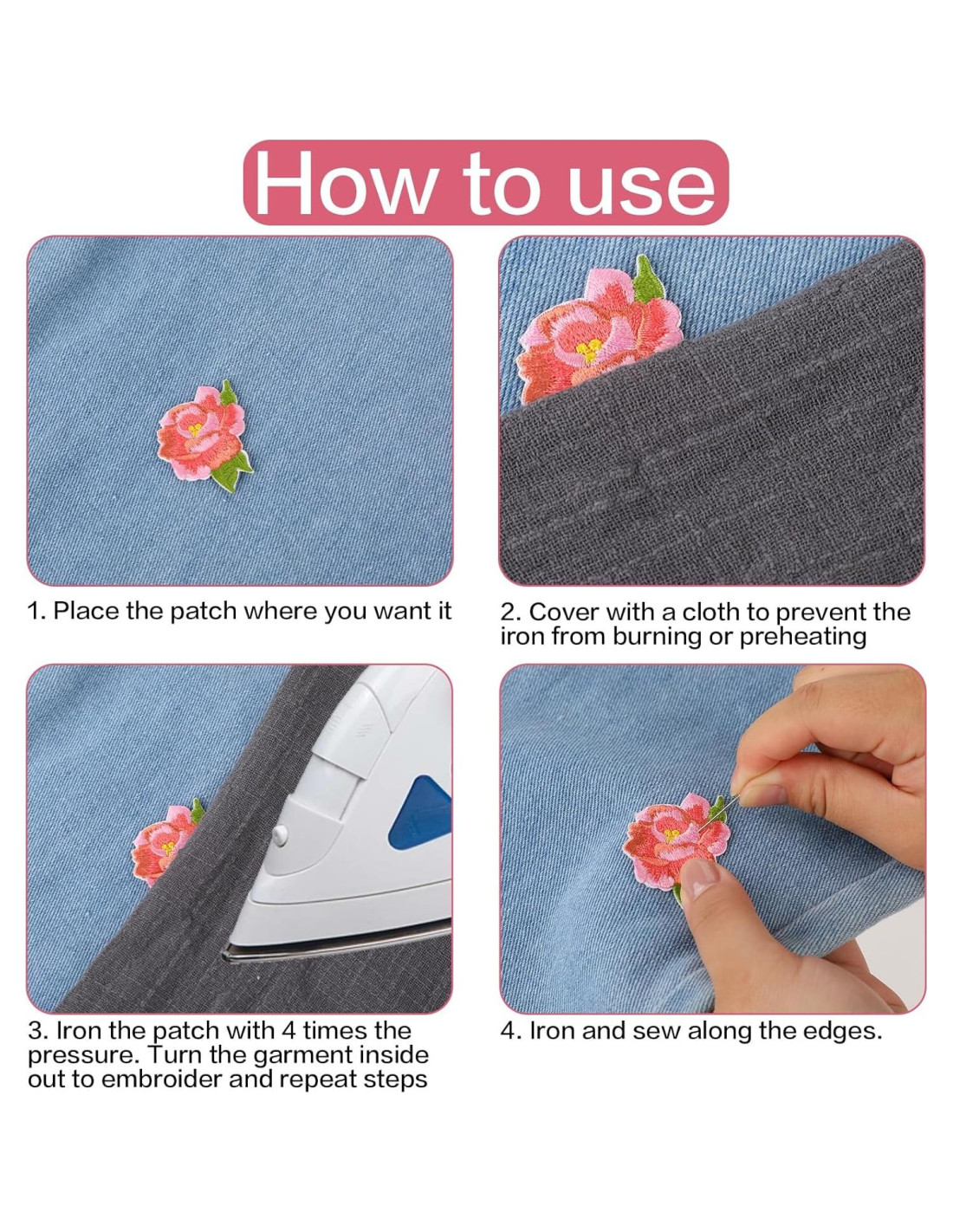 - [Uso Amplio] Los parches bordados se pueden usar para reparar agujeros en jeans, y también son adecuados para decoración de bricolaje o reparación de vestidos, bolsas, jeans, zapatos, camisas, etc.