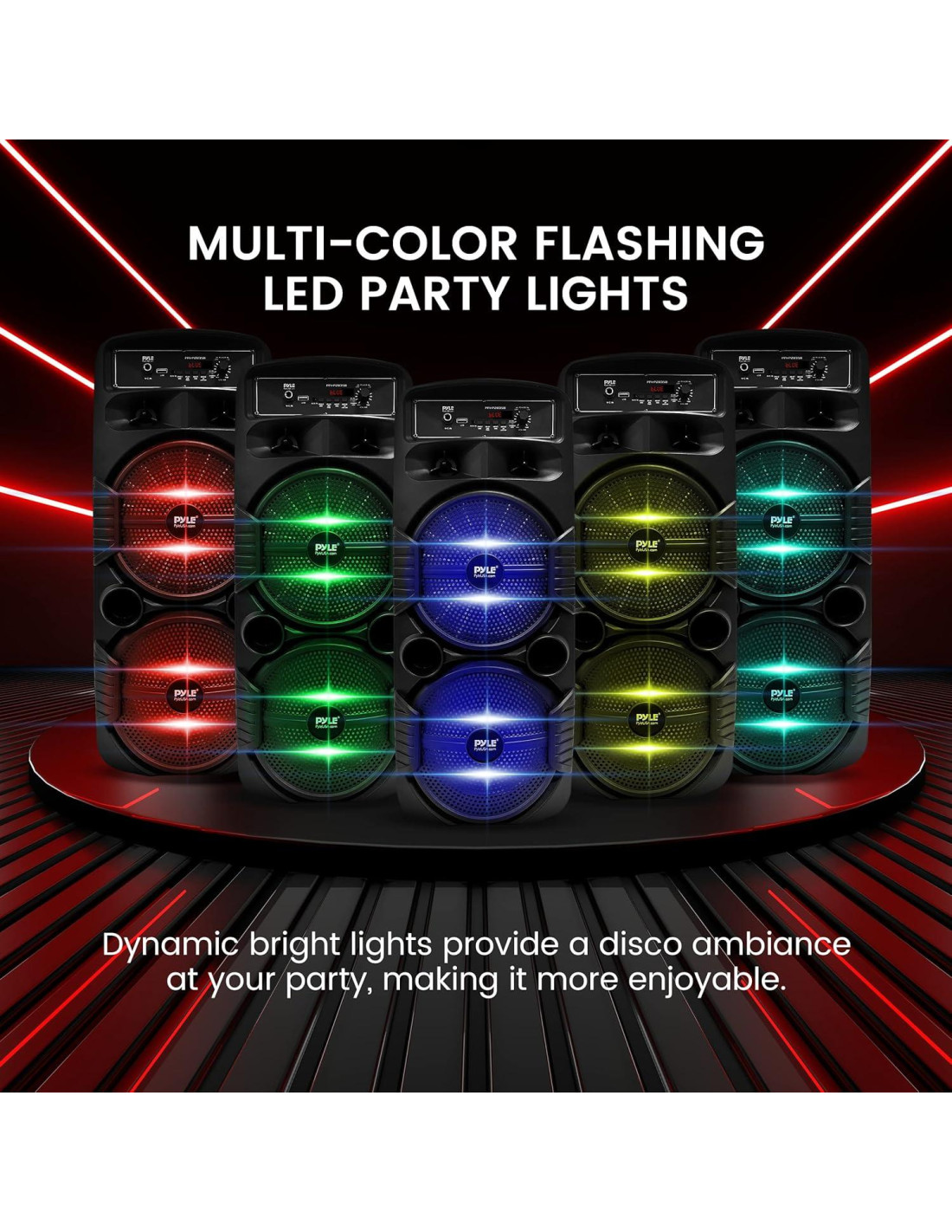 Características: - Sistema de estéreo verdadero inalámbrico - Sistema de altavoces portátil - Altavoz PA de alta potencia - Capacidad de transmisión de música Bluetooth inalámbrica - Luces de fiesta LED multicolores parpadeantes - Batería recargable incorporada - Radio FM con pantalla LED digital - Conectar y transmitir audio desde dispositivos externos - Conector de entrada Aux (3.5mm) - Lector de memoria USB - Entrada para micrófono de 6.5mm - Luces indicadoras de nivel de batería LED - Diseño de gabinete moldeado resistente y duradero - Mango de transporte extensible conveniente - Para uso en interiores / exteriores Transmisión inalámbrica Bluetooth: - Bluetooth incorporado para transmisión de música inalámbrica - Emparejamiento simple y sin complicaciones - Funciona con todos los dispositivos más recientes de hoy - Smartphones, tabletas, laptops, computadoras, etc. - Versión Bluetooth: 4.1 - Nombre de red Bluetooth: 'PYLEUSA' - Alcance inalámbrico: hasta 9.75 m. Qué hay en la caja: - Sistema de altavoces PA - Control remoto - Adaptador de corriente Especificaciones técnicas: - Material: Polipropileno (PP) - Potencia máxima de salida: 600 vatios máximos - Sistema de sonido: Subwoofer de 8" (20.32 cm) x2 + Tweeter de 1" (2.54 cm) - Impedancia: 2.6 Ohm - Tipo de interfaz USB: 2.0 - Soporte de archivo de audio digital: MP3 - Soporte máximo de memoria USB: 32GB - Control remoto alimentado por batería, 1 pieza de batería de botón CR-2025 (incluida) - Duración de la batería: hasta 3 horas (tiempo de carga: aproximadamente 4.5 horas) - Batería recargable: 3.7V, 2400mAh - 8.88 Wh - Fuente de alimentación: 120/240V, conmutables (adaptador de corriente de 5V/2A) - Dimensiones (L x W x H): 23.1 cm x 22.1 cm x 58.9 cm.