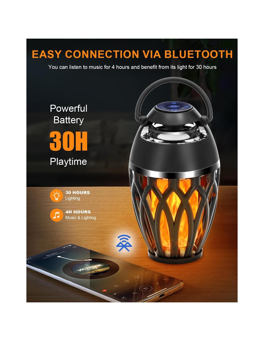 - [Altavoz Lámpara de Llama LED Multifuncional] El altavoz Bluetooth atmosférico Vanten puede traer música envolvente agradable y luces amarillas cálidas parpadeantes LED. No solo es un altavoz Bluetooth portátil, sino también una luz nocturna LED y lámpara atmosférica; con un mango, puedes colgarlo o colocarlo donde desees crear una atmósfera romántica.