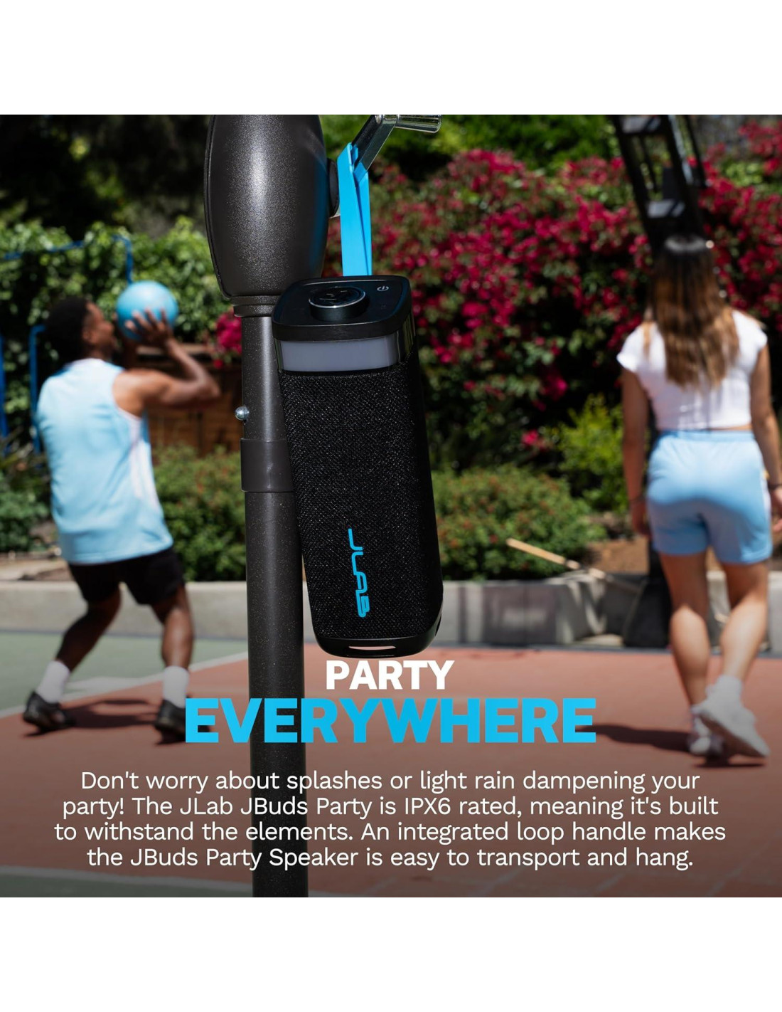 Potencia tu fiesta en cualquier lugar con el altavoz Bluetooth JBuds Party, donde un sonido intenso de siguiente nivel se encuentra con la portabilidad. Este altavoz Bluetooth portátil desata 30 vatios de sonido increíble y ofrece más de 12 horas de tiempo de reproducción, suficiente para toda la diversión del día. Personaliza tu sonido con configuraciones de ecualización personalizables y establece el ambiente con efectos de iluminación RGB dinámicos, todo en la App de JLab. Toma el control con el intuitivo Controlador de Medios de JLab y cuatro botones de acceso rápido, o amplía la experiencia conectando hasta 100 altavoces Bluetooth JLab Party con LabSync para una experiencia de sonido verdaderamente masiva. Con impermeabilidad IP56 y una conveniente correa de bucle, este altavoz está listo para llevar la fiesta a cualquier lugar, en cualquier momento. Sonido de Calidad Lab que Sacude la Habitación: Disfruta de un sonido que golpea el pecho a través de controladores de 2.5" de frecuencia completa dual y dos woofers pasivos de 2". Con 30 vatios de potencia, este altavoz Bluetooth portátil traerá la fiesta. Con sus 12 horas de tiempo de reproducción (más de 10 horas con iluminación RGB), puedes extender tu lista de reproducción para que dure toda la noche. Luces de Fiesta: Este potente portátil ilumina la fiesta con vibrantes luces RGB. Personaliza el color, patrón y frecuencia para que coincida con la vibra a través de la App de JLab. Desde diversión en solitario hasta una fiesta, el altavoz Bluetooth JBuds Party te tiene cubierto. LabSync: Tu Sincronización de Fiesta Definitiva: ¿Listo para convertir tu hogar en un parque de diversiones sonoro? LabSync te permite sincronizar el sonido y las luces para hasta 100 altavoces Bluetooth JLab Party, transformando cada habitación en una zona de fiesta. Imagina una sinfonía de sonido, perfectamente sincronizada, llenando tu hogar con ritmos electrizantes. No más perderse un momento, sin importar dónde estés. Con LabSync, tu fiesta no conoce límites. Emparejamiento Estéreo LabSync: LabSync ofrece una función avanzada para mejorar tu experiencia de audio. Designa cualquier altavoz Bluetooth JLab Party como canales izquierdo o derecho a través de la app para crear un potente sistema estéreo de 2 canales para un escenario de sonido más grande y una experiencia de escucha inmersiva. Disfrutarás de audio dimensional que coloca instrumentos y cantantes donde pertenecen, transformando todo, desde fiestas en casa hasta noches de cine con un sonido rico y equilibrado que llena tu espacio. Fiesta en Todas Partes: ¡No te preocupes por las salpicaduras o la lluvia ligera que arruinen tu fiesta! El JLab JBuds Party tiene una clasificación IP56, lo que significa que está diseñado para resistir los elementos. Un mango de bucle integrado hace que el altavoz Bluetooth JBuds Party sea fácil de transportar y colgar. Ya sea junto a la piscina, en la playa, o si alguien derrama una bebida, la música no se detendrá. Personaliza Tu Sonido + Experiencia a través de la App de JLab: Con la App de JLab, personaliza la iluminación RGB, los controles y el sonido a tu preferencia personal, o utiliza los preajustes EQ4 para JLab Signature, Balance o Bass Boost. Además, recibe actualizaciones de software para tu producto justo cuando estén disponibles. Disponible en la App Store o Google Play Store.