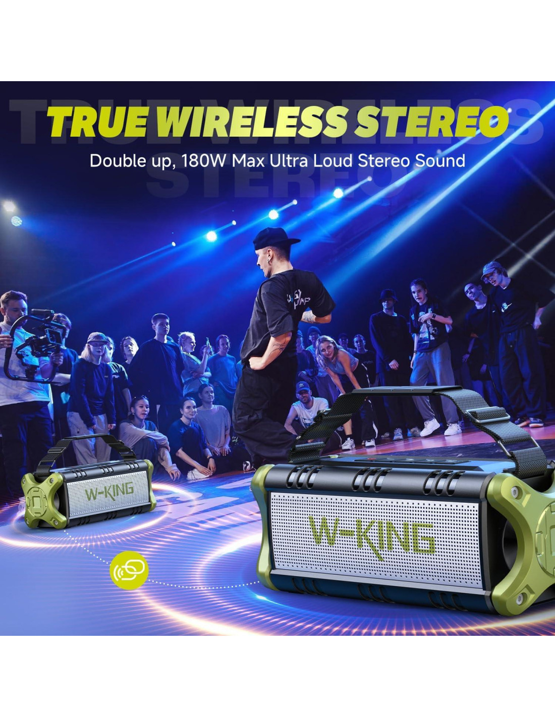 - 180W PICO Sonido Estéreo Súper Poderoso: Empareja fácilmente 2 altavoces bluetooth W-KING D8 de forma inalámbrica, actualizando inmediatamente el sonido estéreo envolvente de 180W MAX 100W RMS para brindarte una experiencia de cine en casa ultra portátil. En este momento, los dos altavoces forman los canales izquierdo y derecho. A través de la reflexión del entorno, te rodea con el sonido y te brinda una experiencia de audio envolvente estéreo super. Lleva los altavoces bluetooth inalámbricos para películas, fiestas, juegos, gimnasio, camping, BBQ, viajes, fiesta en la piscina.
