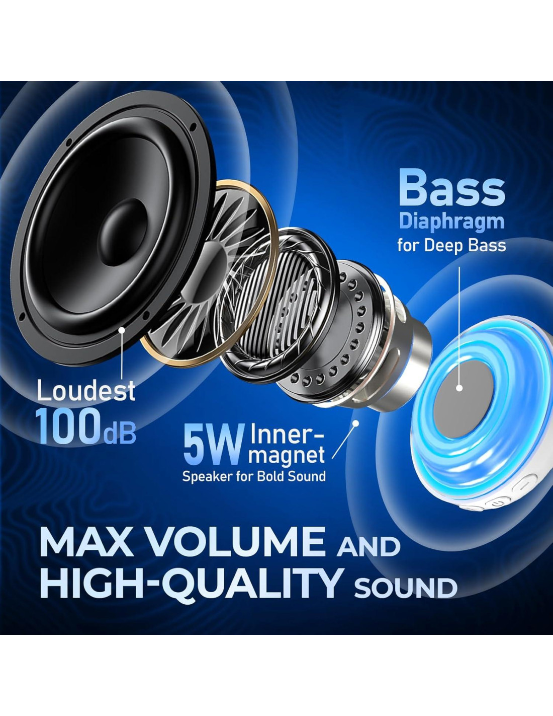 - Disfruta de Sonido de Alta Calidad Sobre 600m. Equipado con un altavoz de imán interno de 5W RMS, el altavoz ofrece un sonido excelente. El volumen máximo puede alcanzar 100 dB y cubre 600m, superando con creces el de cualquier otro mini altavoz bluetooth. Otra diferencia significativa es que el nuestro está equipado con un diafragma de bajo independiente en la parte inferior, haciendo que el rendimiento de los bajos y los ritmos de batería sean más rítmicos. Y los parlantes bluetooth soportan la función TWS, permitiendo que dos altavoces reproduzcan simultáneamente.