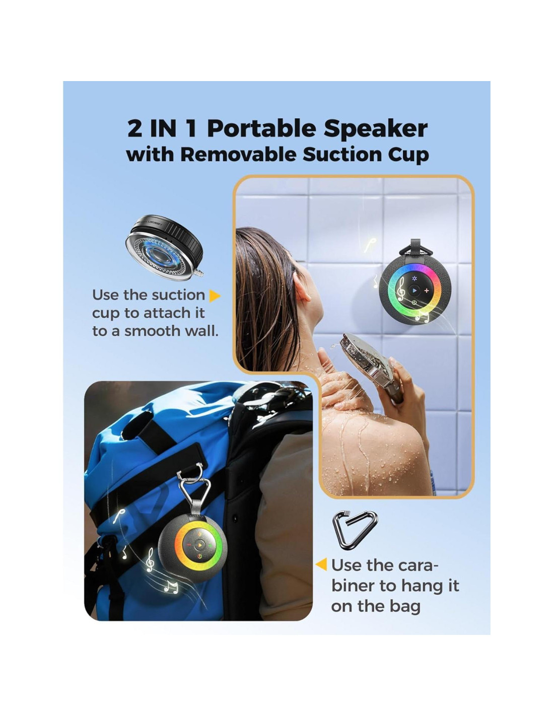 - [Altavoz Bluetooth 2 EN 1]: Con la ventosa adjunta, se adhiere a superficies lisas como vidrio, lo que lo hace adecuado para fiestas de baile en la ducha o cocina. Cuando se retira, el altavoz se convierte en un dispositivo más portátil que se puede colgar en una bolsa o kayak. Ya sea que estés en casa, al aire libre o en movimiento, este altavoz puede adaptarse fácilmente a tu estilo de vida.