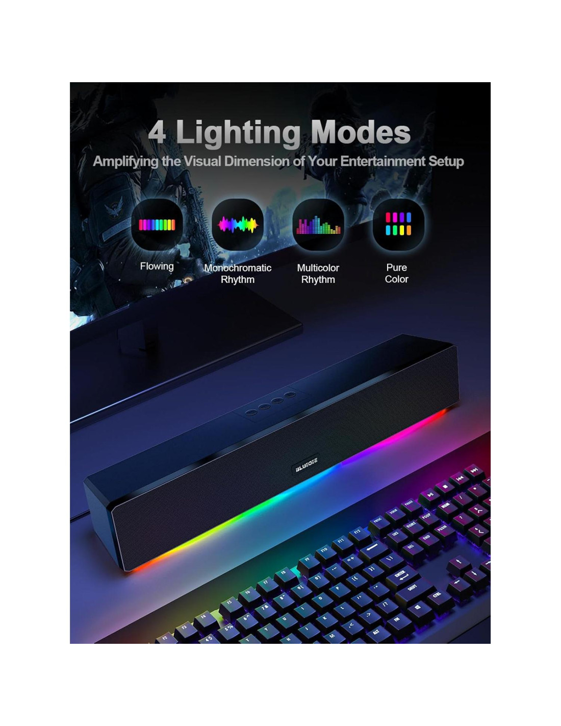 - [Luces de ambiente relajantes] Los altavoces de PC Bluedee para escritorio soportan cuatro efectos de iluminación ambiental, incluyendo Fluido, Ritmo Monocromático, Ritmo Multicolor y Color Puro, haciendo visible el sonido y añadiendo inmersión a tu música o juegos (Las luces también se pueden apagar).