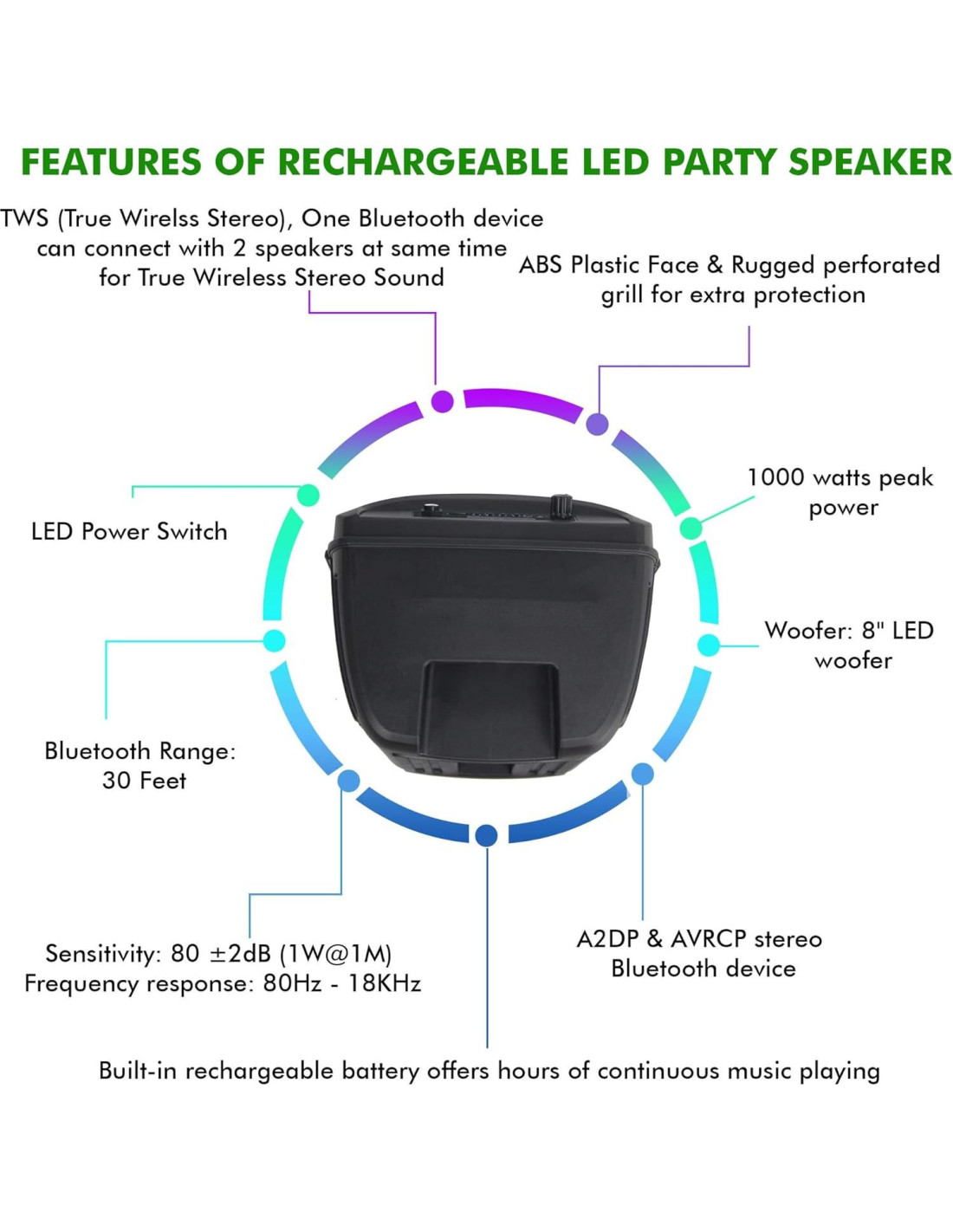 Este altavoz Bluetooth LED recargable de 8 pulgadas tiene una potencia máxima de 1000 vatios. Cuenta con una batería recargable incorporada que permite horas de reproducción continua de música.