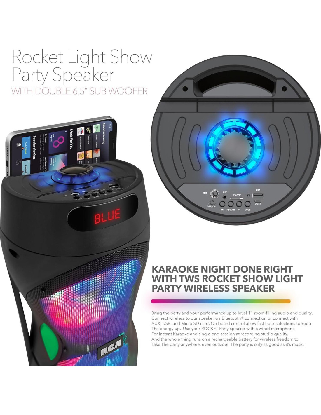 Prepárate para dar vida a la fiesta con el Altavoz Bluetooth RCA Disco 206 RGB de Top Tech, una potencia de audio portátil diseñada para realzar cualquier celebración. Con dobles woofers de 6.5" (16,51 cm), este altavoz ofrece graves profundos y sonido cristalino, llenando cualquier espacio con audio rico e inmersivo que hace que todos se muevan. Ya sea que estés organizando una fiesta de baile, disfrutando de una sesión de karaoke o simplemente relajándote en casa, el Disco 206 asegura que tu música suene tan vibrante y dinámica como se pretendía. La característica destacada del Disco 206 es su exhibición de luces neón RGB de 7 colores, que se sincroniza con el ritmo de tu música para crear una experiencia visual cautivadora. Perfecto para cumpleaños, celebraciones o reuniones informales, estas luces transforman cualquier entorno en una atmósfera electrizante, asegurando que cada momento sea inolvidable. Diseñado para la versatilidad, el Disco 206 ofrece múltiples opciones de reproducción. Transmite música sin esfuerzo a través de Bluetooth, reproduce directamente desde USB o tarjetas SD, o sintoniza la radio FM en vivo para mayor variedad. Sus controles de audio personalizables, que incluyen volumen de micrófono, agudos, graves y ajustes de eco, lo hacen ideal para karaoke o hablar en público, permitiéndote adaptar tu sonido a tus necesidades. La portabilidad es fácil con el mango de carro y las ruedas incorporadas del Disco 206, lo que te permite llevar tu música a cualquier lugar, desde una fiesta en la playa hasta una barbacoa en el patio trasero. Ligero y fácil de transportar, este altavoz está diseñado para la conveniencia, asegurando que puedas configurar y disfrutar de tus melodías favoritas sin complicaciones. Combinando visuales impresionantes, sonido potente y portabilidad inigualable, el Altavoz Bluetooth RCA Disco 206 RGB de Top Tech es la elección definitiva para los amantes de la música que desean elevar sus eventos con entretenimiento vibrante y un rendimiento de audio excepcional.