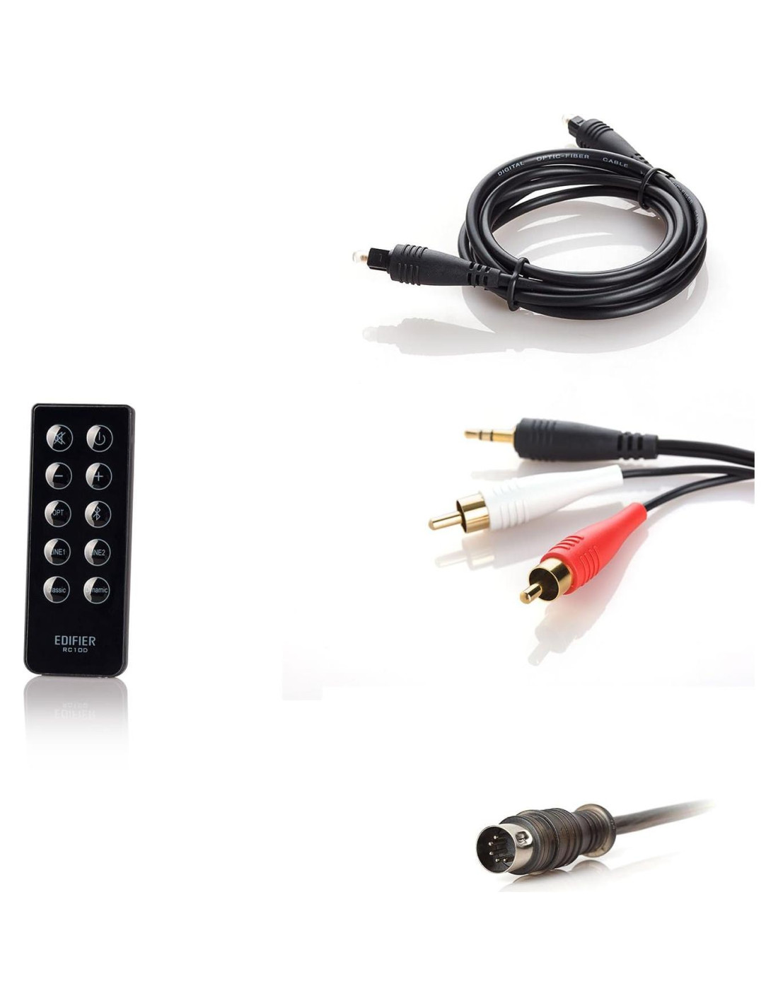 - Componentes incluidos: 2X Altavoces, Control Remoto, Cable de 3.5mm a RCA, cable RCA a RCA, cable de audio óptico de fibra, cable de conexión de altavoz AC Universal 100-240V, 50/60HZ