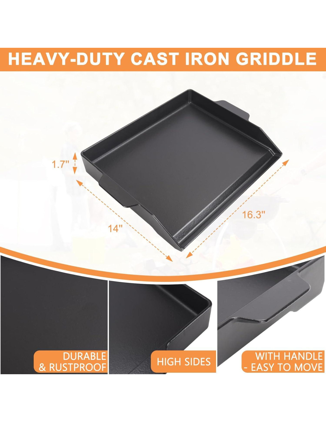 - Especificaciones: Dimensiones: 16.3" L x 14" W (superficies de cocción), 18.6" L x 14" W x 1.7" H (tamaño total); El paquete incluye: 1 plancha de fondo plano para estufa de 4 quemadores; Material: El inserto de plancha universal está hecho de hierro fundido de alta calidad y asegura una distribución uniforme del calor y una retención superior del calor. Plancha para estufa de camping para asar en parrilla de gas al aire libre, haciendo que tu vida de barbacoa al aire libre sea más colorida, también es el accesorio perfecto para necesidades de cocina al aire libre.